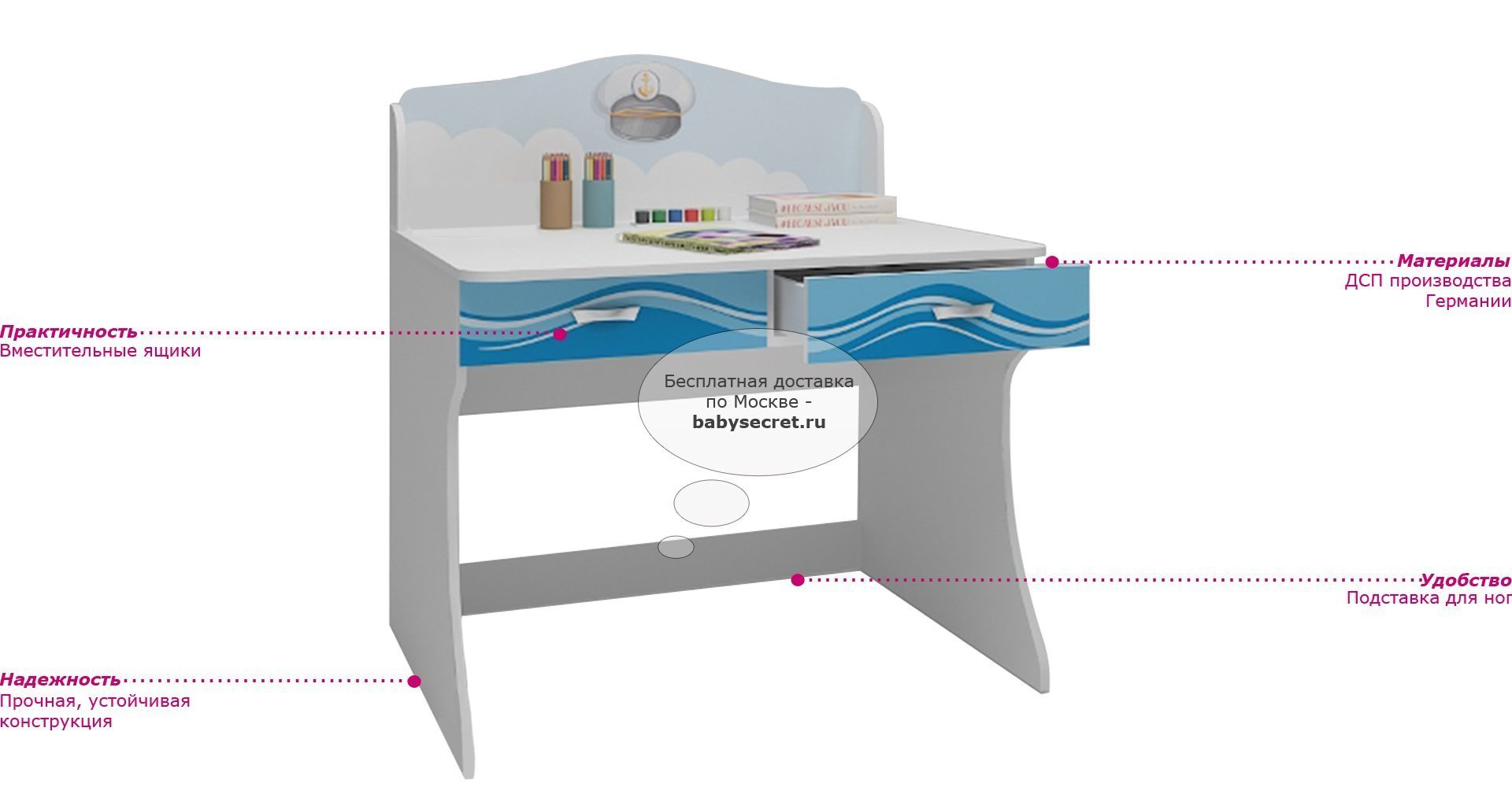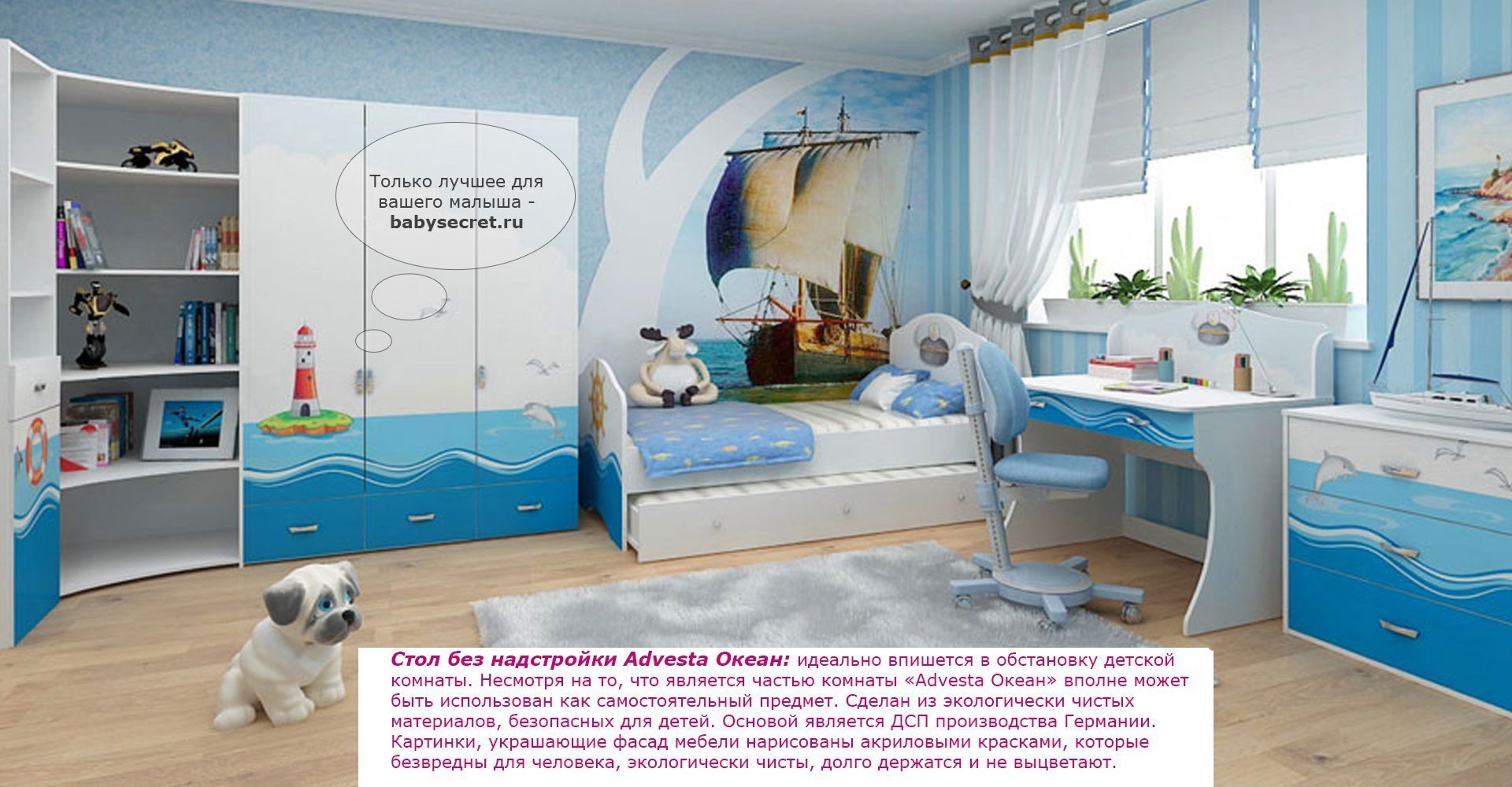 Приятные особенности стола Океан: дизайн стола оформлен в общем стиле комнаты, что делает его приятным дополнением. Корпус сделан из экологически чистых материалов, безопасных для детей. Основой является ДСП производства Германии, где предъявляются самые строгие требования к качеству. У мебели есть преимущество, которое понравится, как детям, так и взрослым. Детскую мебель можно красиво оформить специальными картинками, которые изготовлены из прочных и долговечных материалов, позволяющих проводить влажную уборку. Картинки, украшающие фасады мебели нарисованы акриловыми красками, которые безвредны для человека, экологически чисты, долго держатся и не выцветают.