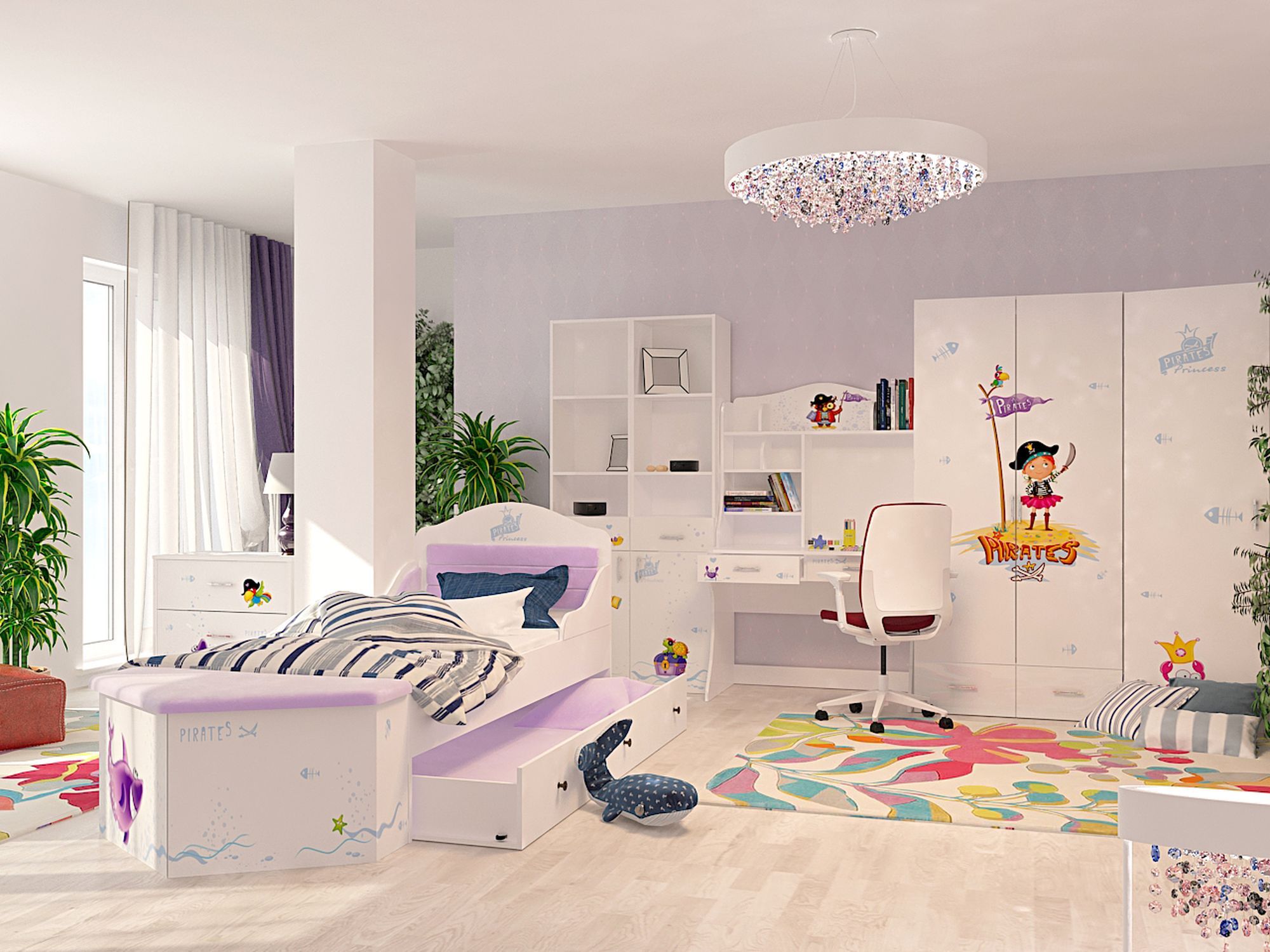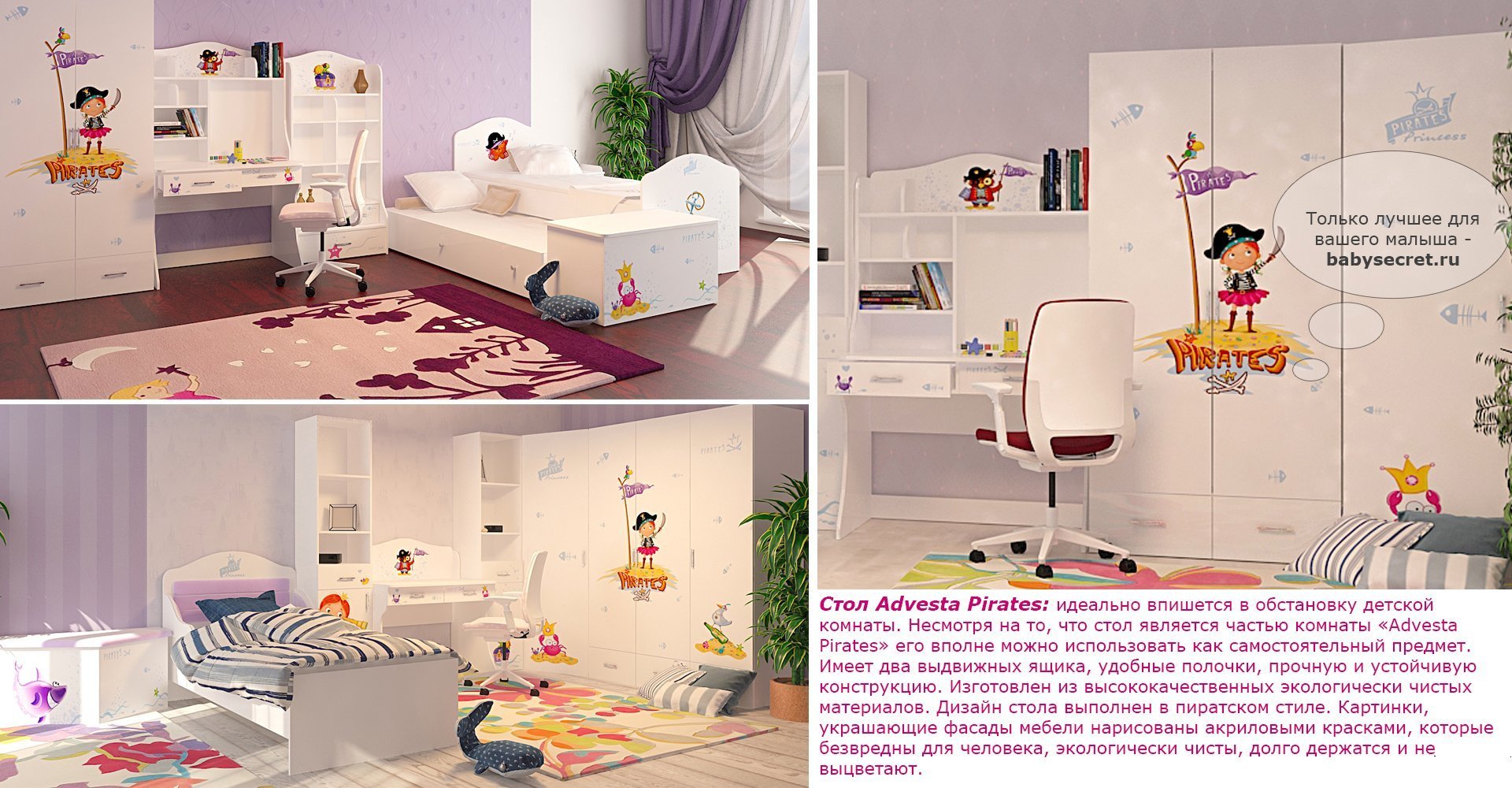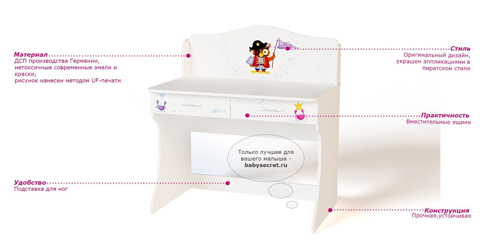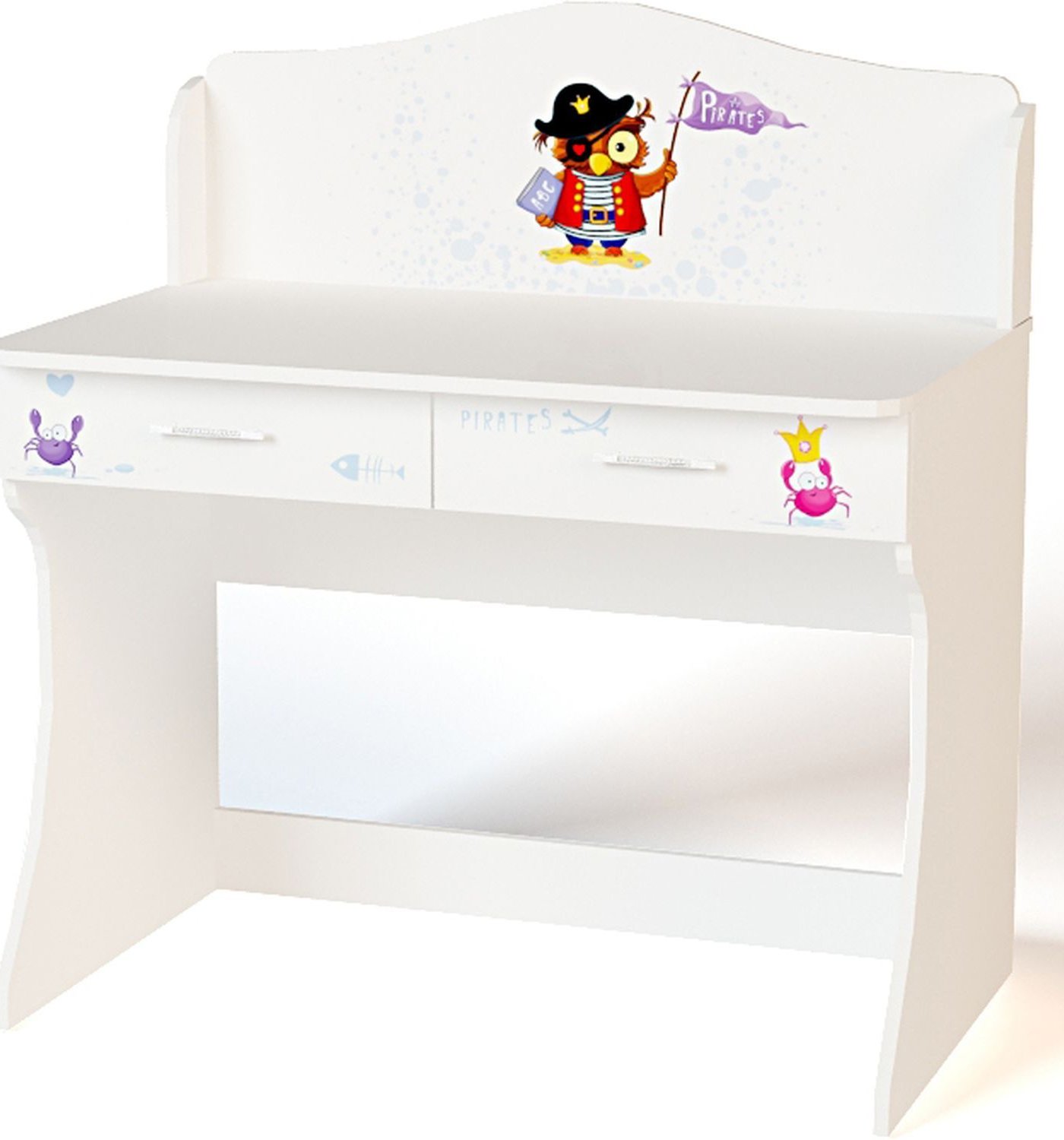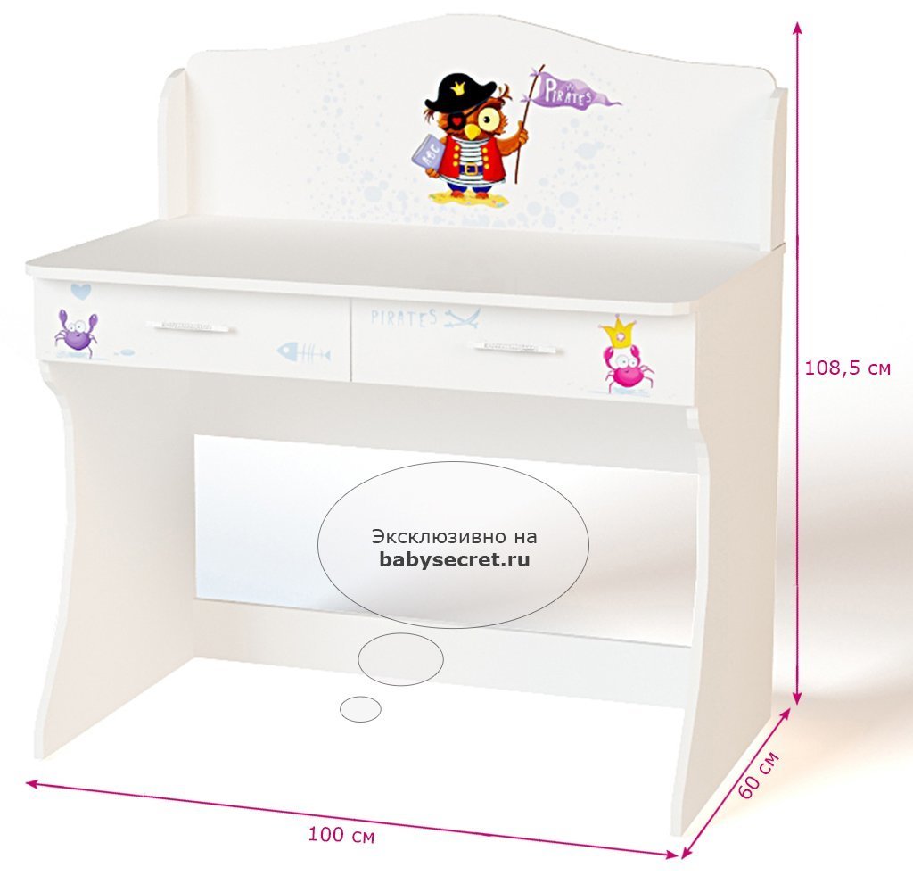 Приятные особенности стола Pirates: идеально впишется в обстановку детской комнаты. Несмотря на то, что стол является частью комнаты «Pirates» его вполне можно использовать как самостоятельный предмет. Имеет два выдвижных ящика, удобные полочки, прочную и устойчивую конструкцию. Изготовлен из высококачественных экологически чистых материалов. Дизайн стола выполнен в пиратском стиле. Картинки, украшающие фасады мебели нарисованы акриловыми красками, которые безвредны для человека, экологически чисты, долго держатся и не выцветают.