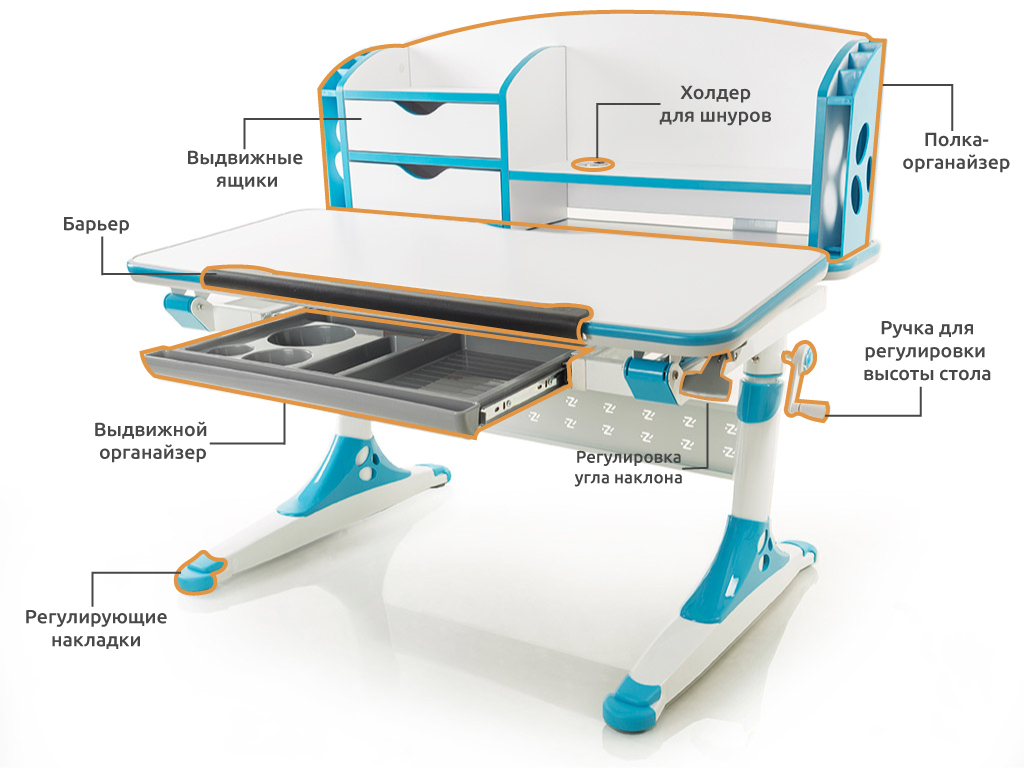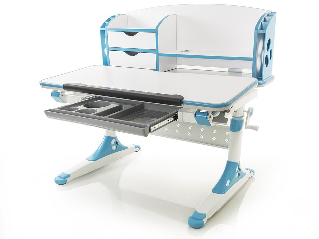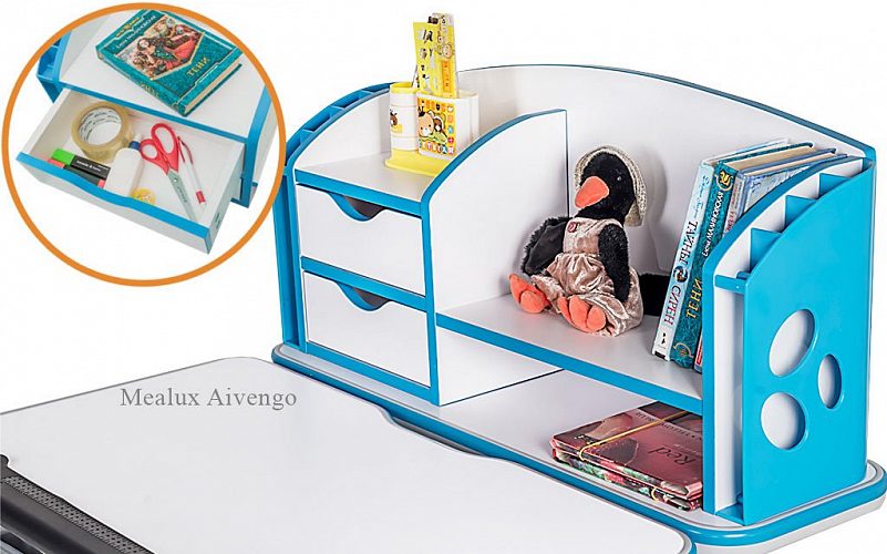 Приятные особенности: Стол Mealux Aivengo-M - очень удобный и очень вместительный. Большая столешница, надстройка со множеством отделений для хранения книг и тетрадей. Столешница покрыта специальными красками и лаками, которые отталкивают воду и легко поддаются чистке. Под столешницей есть выдвижной ящик для хранения канцелярских принадлежностей. С помощью ручного механизма Вы можете регулировать высоту парты, тем самым парта растёт вместе с малышом. А с помощью газ лифта, Вы можете отрегулировать угол наклона столешницы. На ножках парты есть специальные мягкие накладки, чтобы установить парту ровно относительно уровню пола. Чтобы Ваш ребёнок не поранился всё края парты имеют силиконовые ограничители. А специальный барьер на караю столешницы предотвратит падение книг и тетрадей с парты. Это просто идеальное приобретение к школе для вашего ребенка.