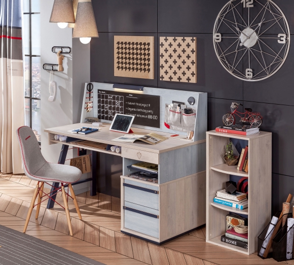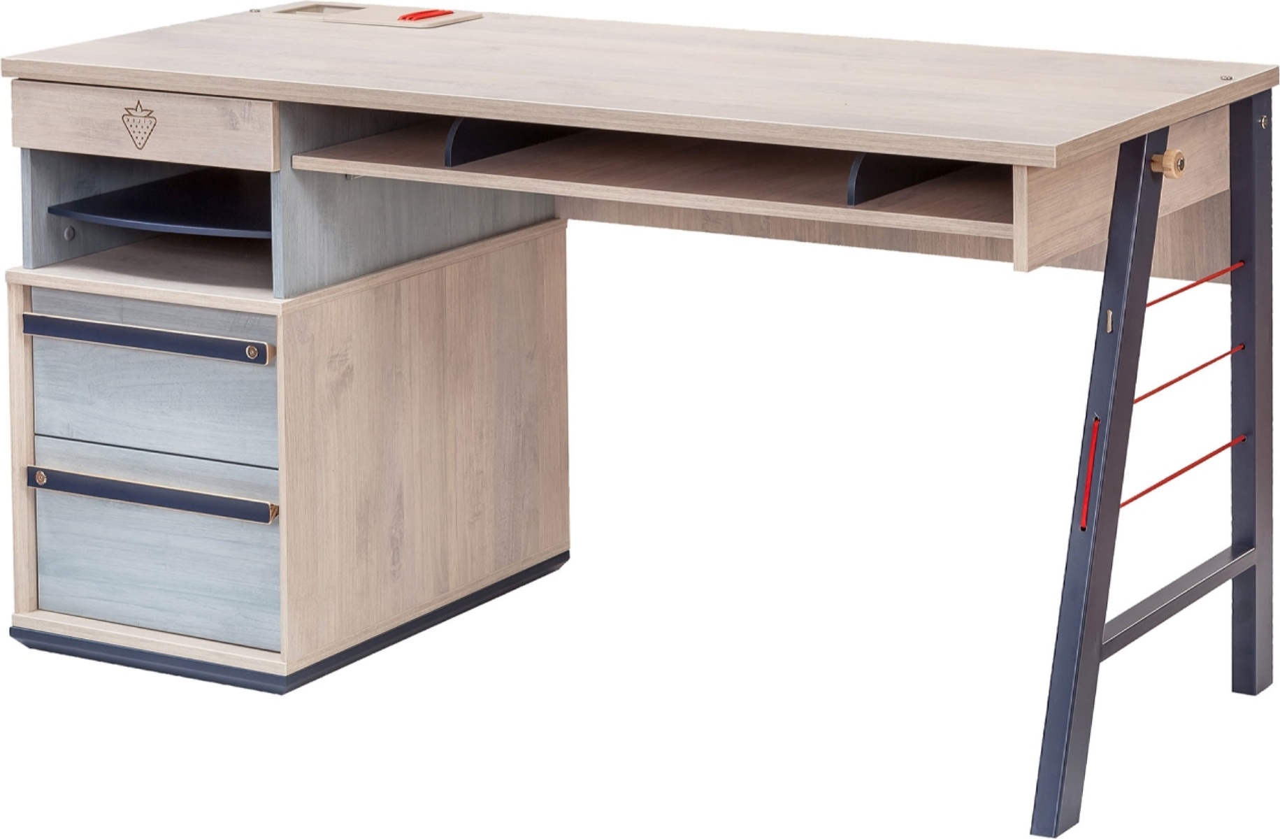 Приятные особенности:Столик «Trio» от компании «Cilek» (Турция) — отличное решение для небольшой детской. Столешница и тумбочка для книг выполнены из ЛДСП светло-бежевого цвета. Расположенная с левой стороны двойная ножка — из окрашенного порошковой краской металла. Торцы «деревянных» деталей защищены от влаги и физических повреждений пластиковой ABS-кромкой. Все поверхности изделия можно мыть влажной губкой. Модель проста в уходе и очень удобна. Сразу под столешницей расположен выдвижной ящичек для канцелярских принадлежностей и выдвижная же панель для хранения тетрадок, книг. Фасад ящика украшен фирменной резной клубничкой «Cilek». С правой стороны под столешницей расположены 2 тумбочки и небольшая ниша с выдвижной панелью для альбомов, тетрадей. Сбоку к столу прикреплен крючок с круглой насадкой. На него ребенок может повесить рюкзак, чтобы все необходимое всегда было под рукой. Столик «Trio» — удобная, функциональная и элегантная модель детской мебели. Подойдет как учащемуся младших классов, так и подростку. Для полной комплектации достаточно докупить стульчик с функцией регулировки высоты.