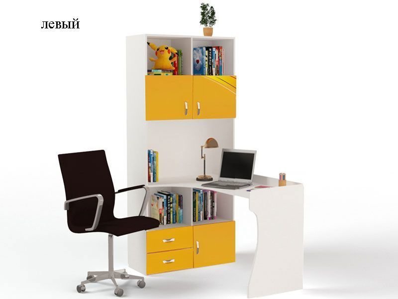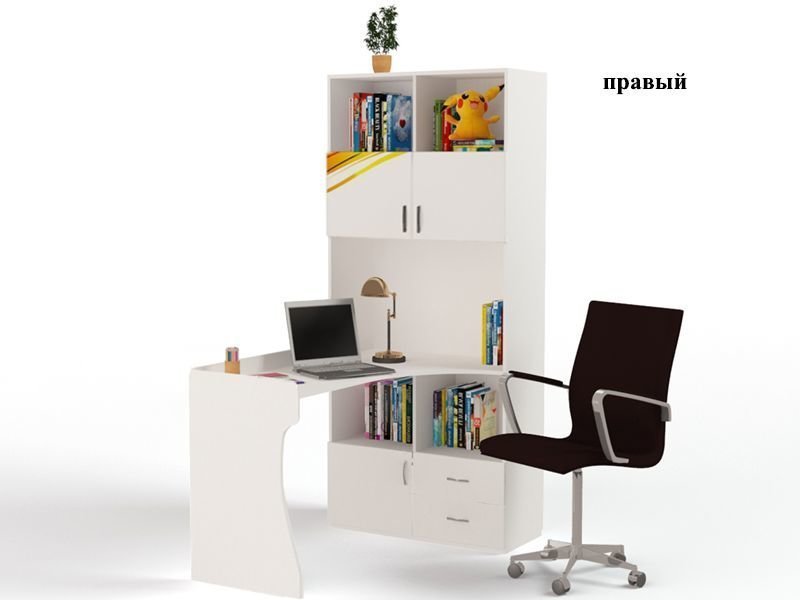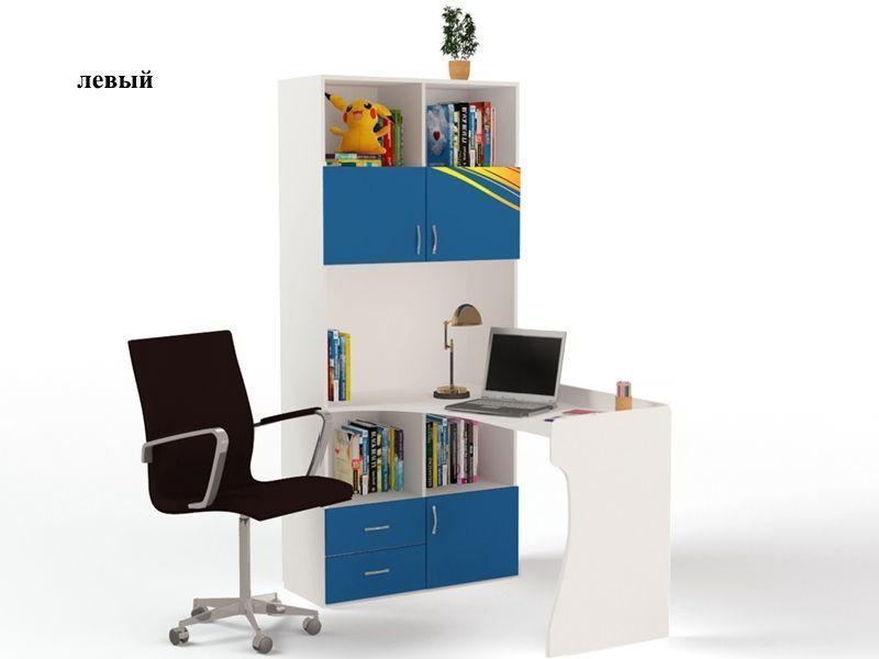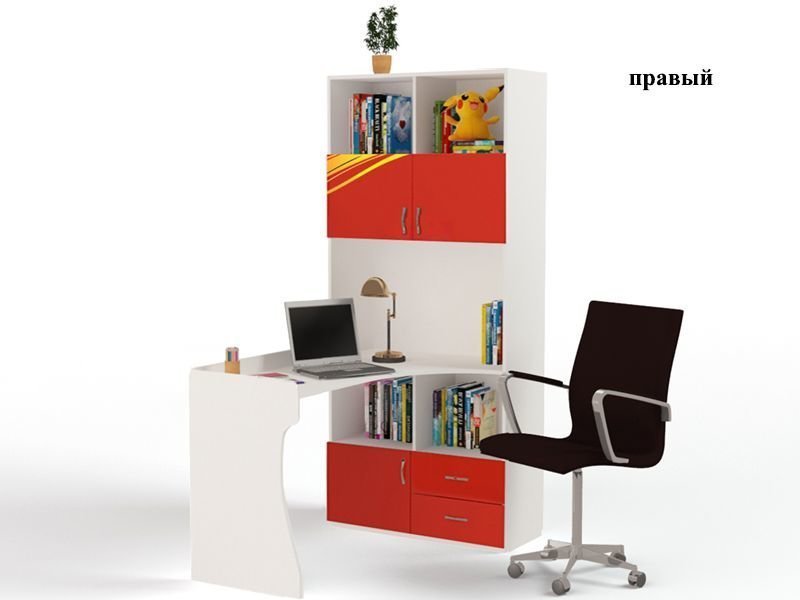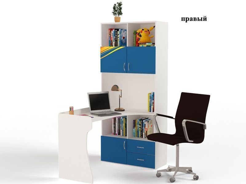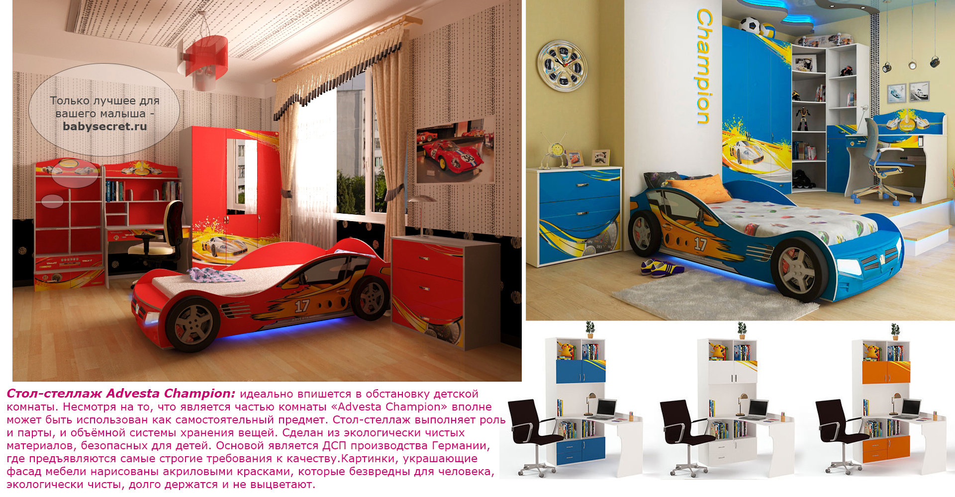 Приятные особенности стол-стеллажа Champion: У мебели есть преимущество, которое понравится, как детям, так и взрослым. Детскую мебель можно красиво оформить специальными картинками, которые изготовлены из прочных и долговечных материалов, позволяющих проводить влажную уборку. Картинки, украшающие фасады мебели нарисованы акриловыми красками, которые безвредны для человека, экологически чисты, долго держатся и не выцветают.
