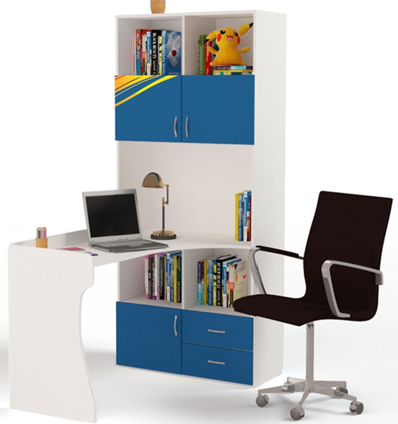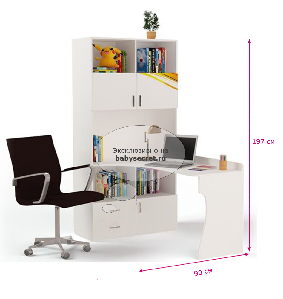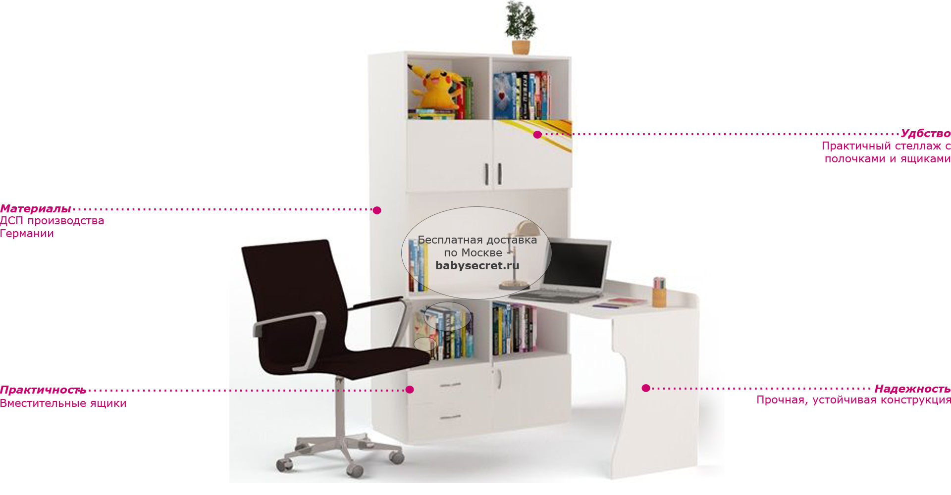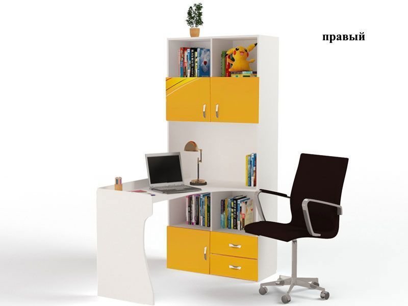 Приятные особенности стол-стеллажа Champion: У мебели есть преимущество, которое понравится, как детям, так и взрослым. Детскую мебель можно красиво оформить специальными картинками, которые изготовлены из прочных и долговечных материалов, позволяющих проводить влажную уборку. Картинки, украшающие фасады мебели нарисованы акриловыми красками, которые безвредны для человека, экологически чисты, долго держатся и не выцветают.