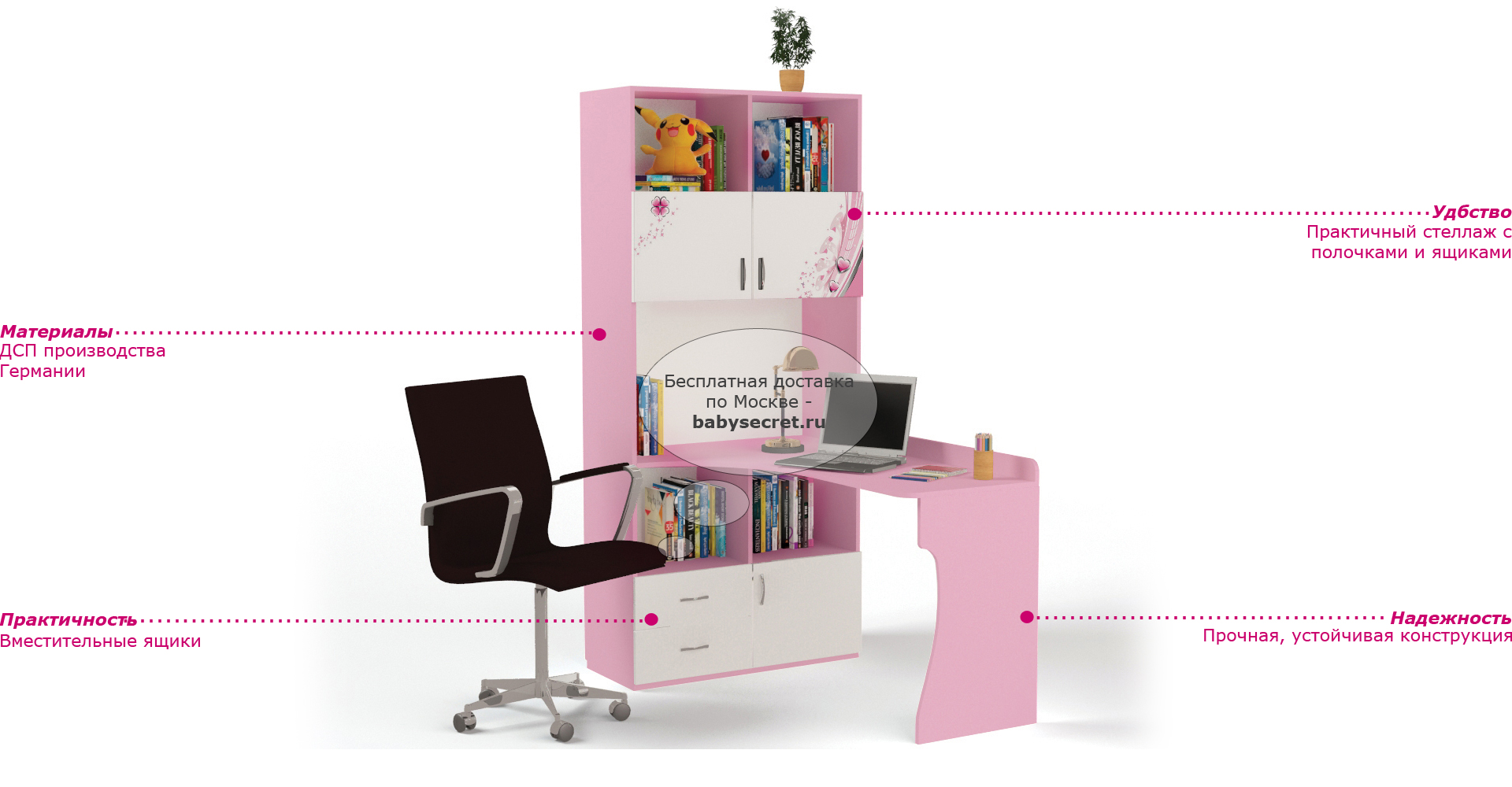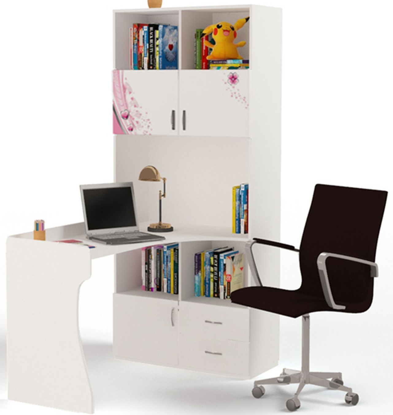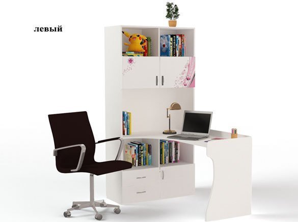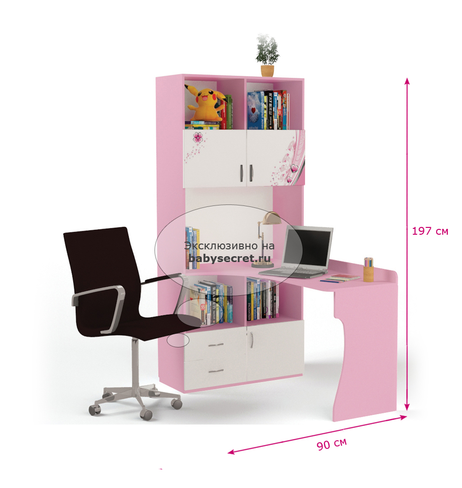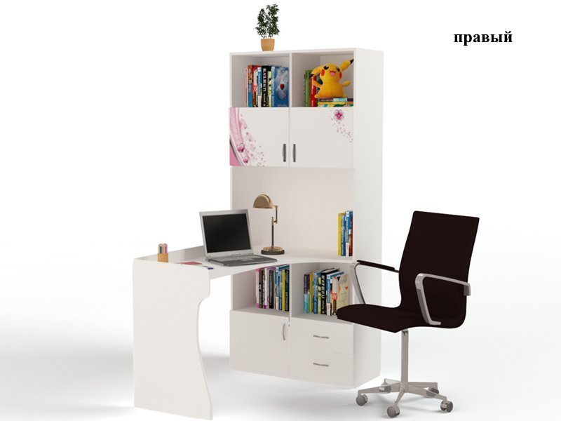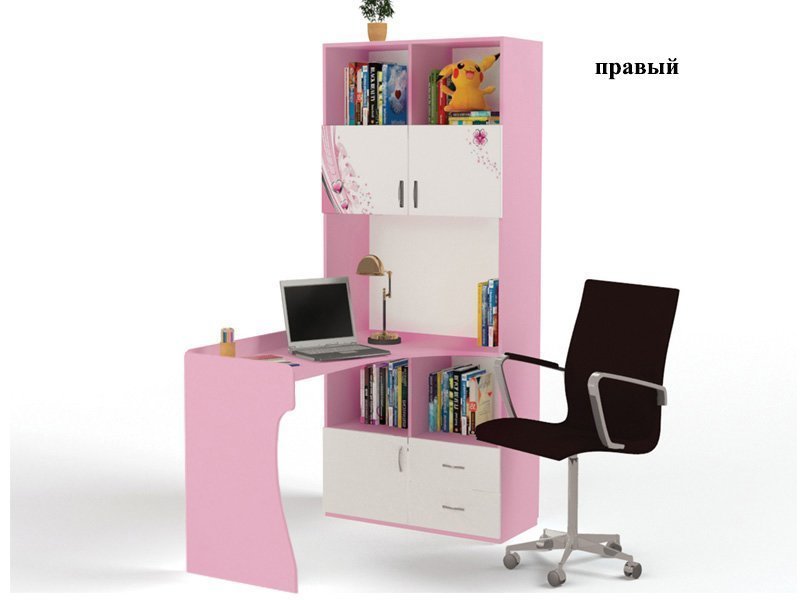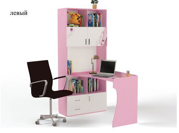 Приятные особенности стол-стеллажа Princess (правый и левый):У мебели есть преимущество, которое понравится, как детям, так и взрослым. Детскую мебель можно красиво оформить специальными картинками, которые изготовлены из прочных и долговечных материалов, позволяющих проводить влажную уборку. Картинки, украшающие фасады мебели нарисованы акриловыми красками, которые безвредны для человека, экологически чисты, долго держатся и не выцветают.