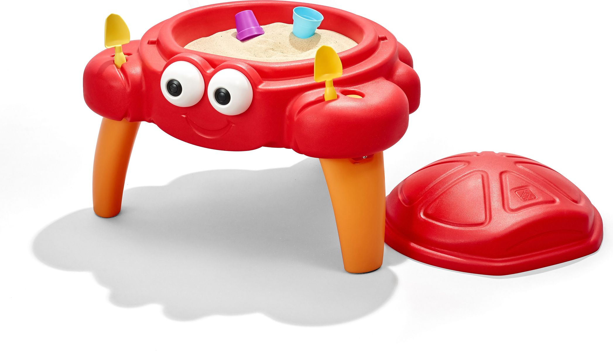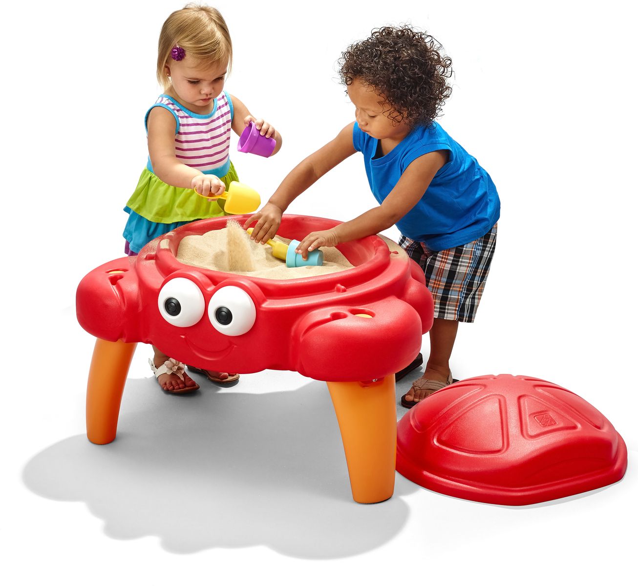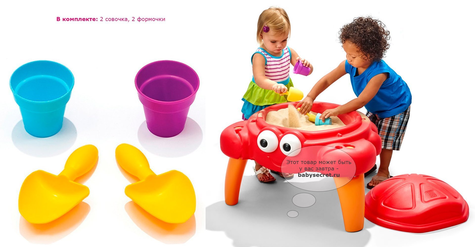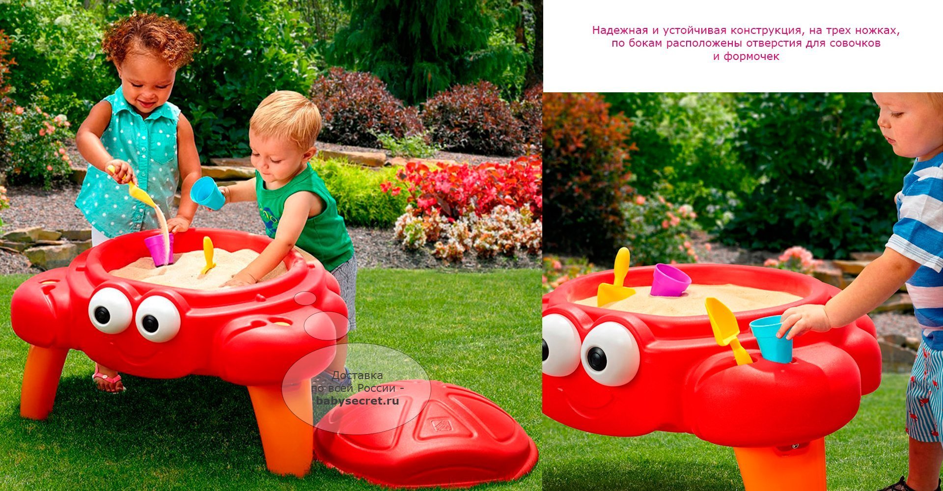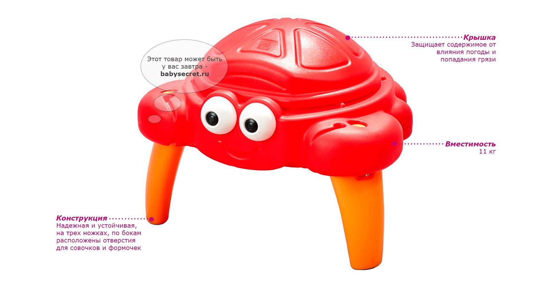 Приятные особенности столика для игр с песком Step 2 Крабик:станет излюбленным местом для игр вашего малыша. Наш Крабик теперь на ножках, что позволяет детям играть стоя. В комплекте идут лопатки и формочки для строительства песочных замков. Столик поставляется в комплекте с крышкой, что позволяет сохранить песок сухим и читым.