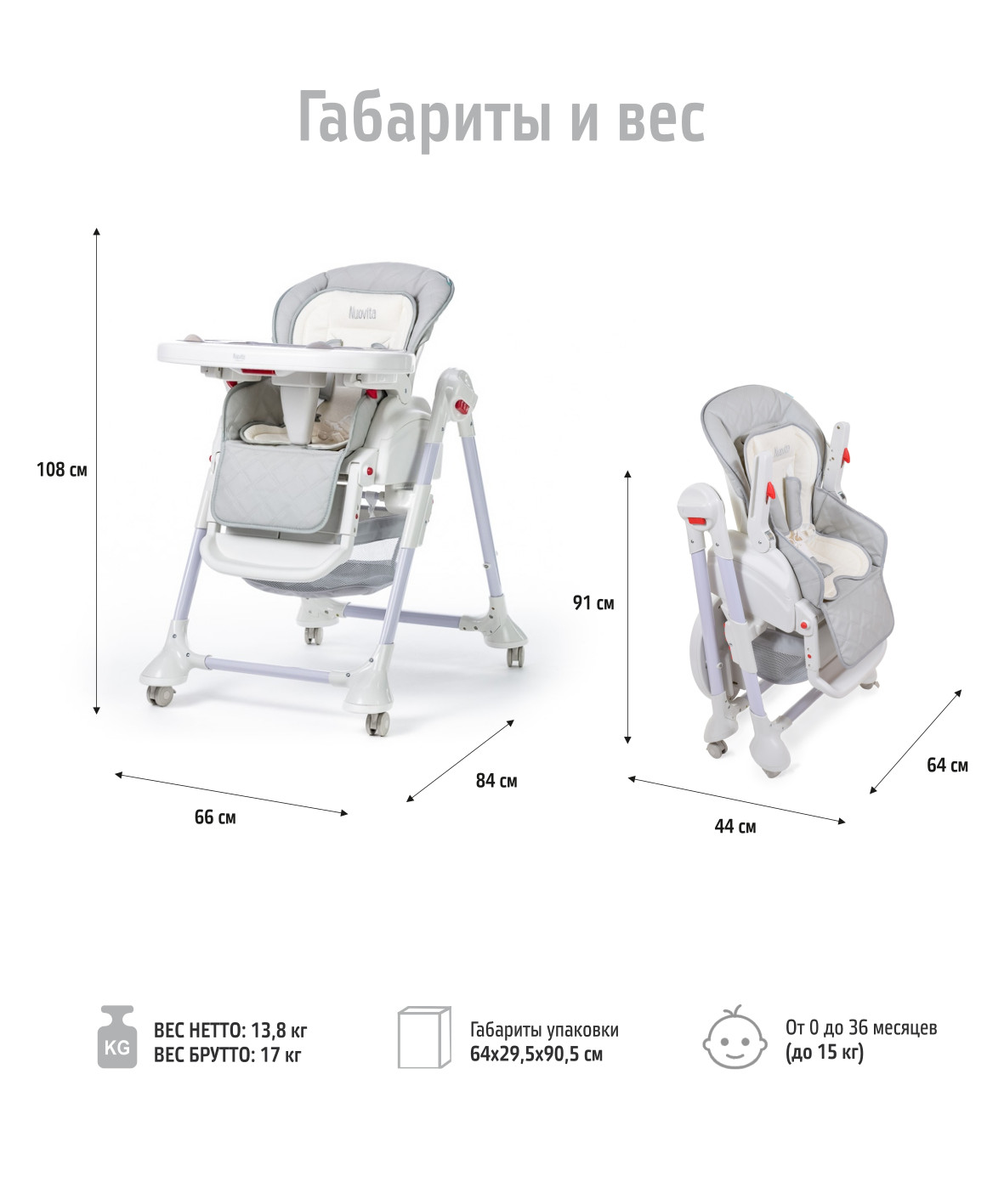 Изделие рассчитано на использование с рождения малыша и до 3-х лет (до достижения им веса 15 кг) За счет дополнительных элементов (укачивающий маятник) вес достигает 13,8 кг, по этой же причине стульчик отличается несколько более значительными габаритами, имея размер 84х66х108см (при складывании — 91х44х64см).