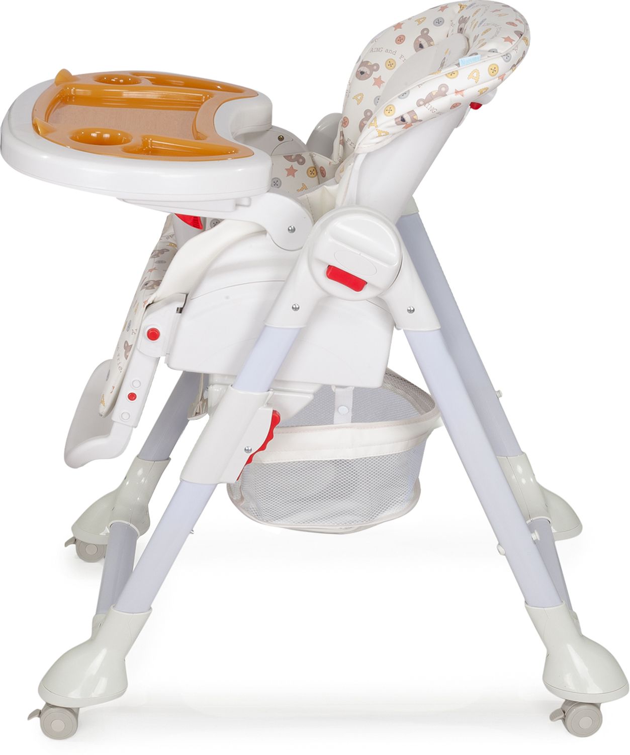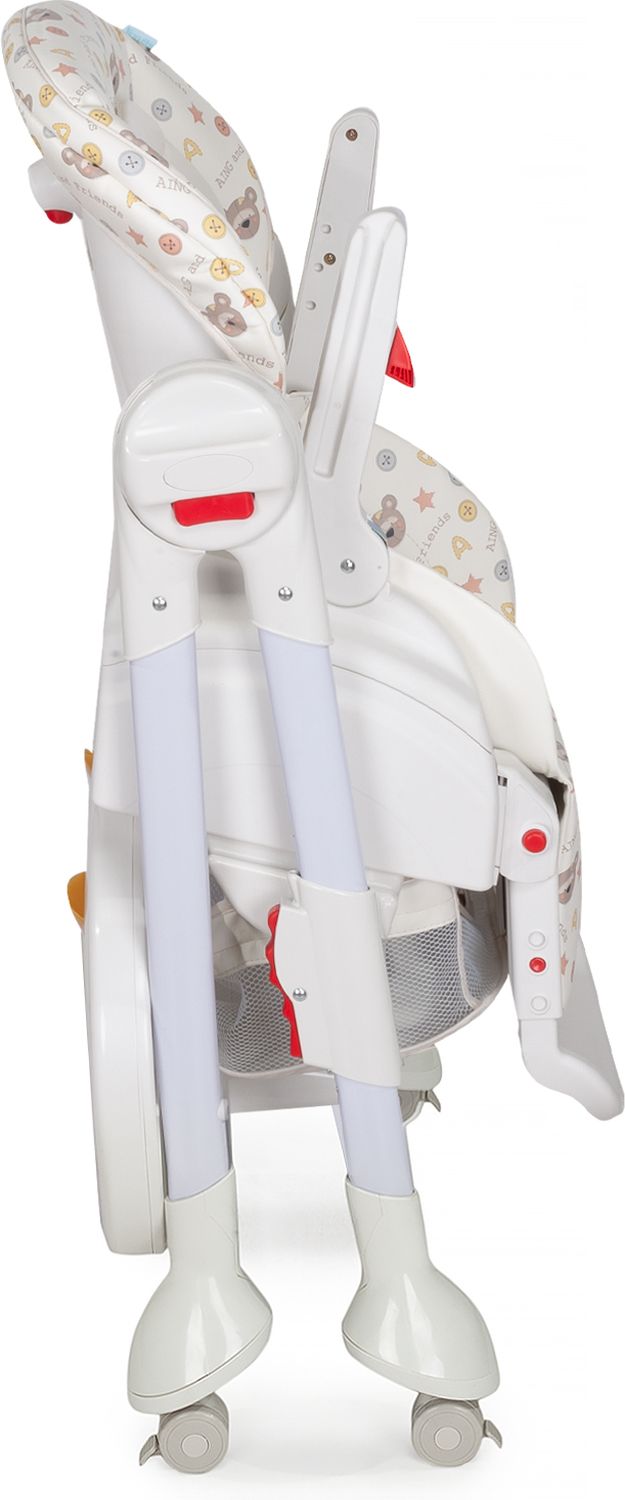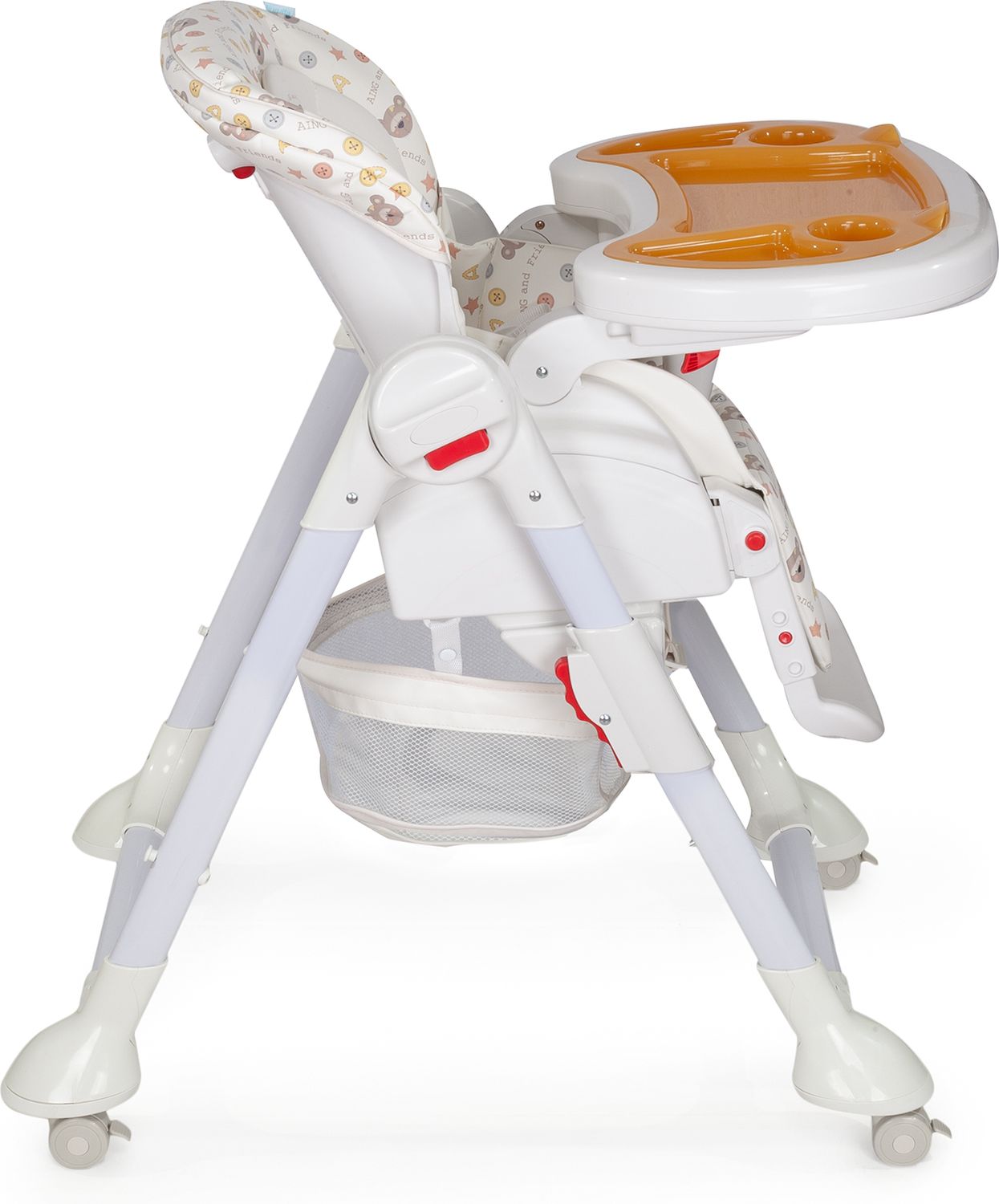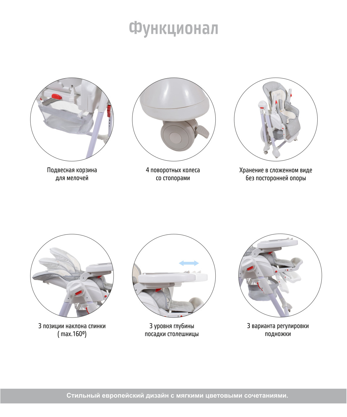 Сидение выполнено из качественной экокожи, которая прочна и проста в уходе. Отдельного внимания заслуживает стильный европейский дизайн с мягкими цветовыми сочетаниями. Дополнительными преимуществами для владельцев станут такие приятные «мелочи», как съёмный поднос с углублениями для чашек и бутылочек; корзинка для игрушек; поворотные колеса с надежной фиксацией и возможность хранения в сложенном виде без посторонней опоры.