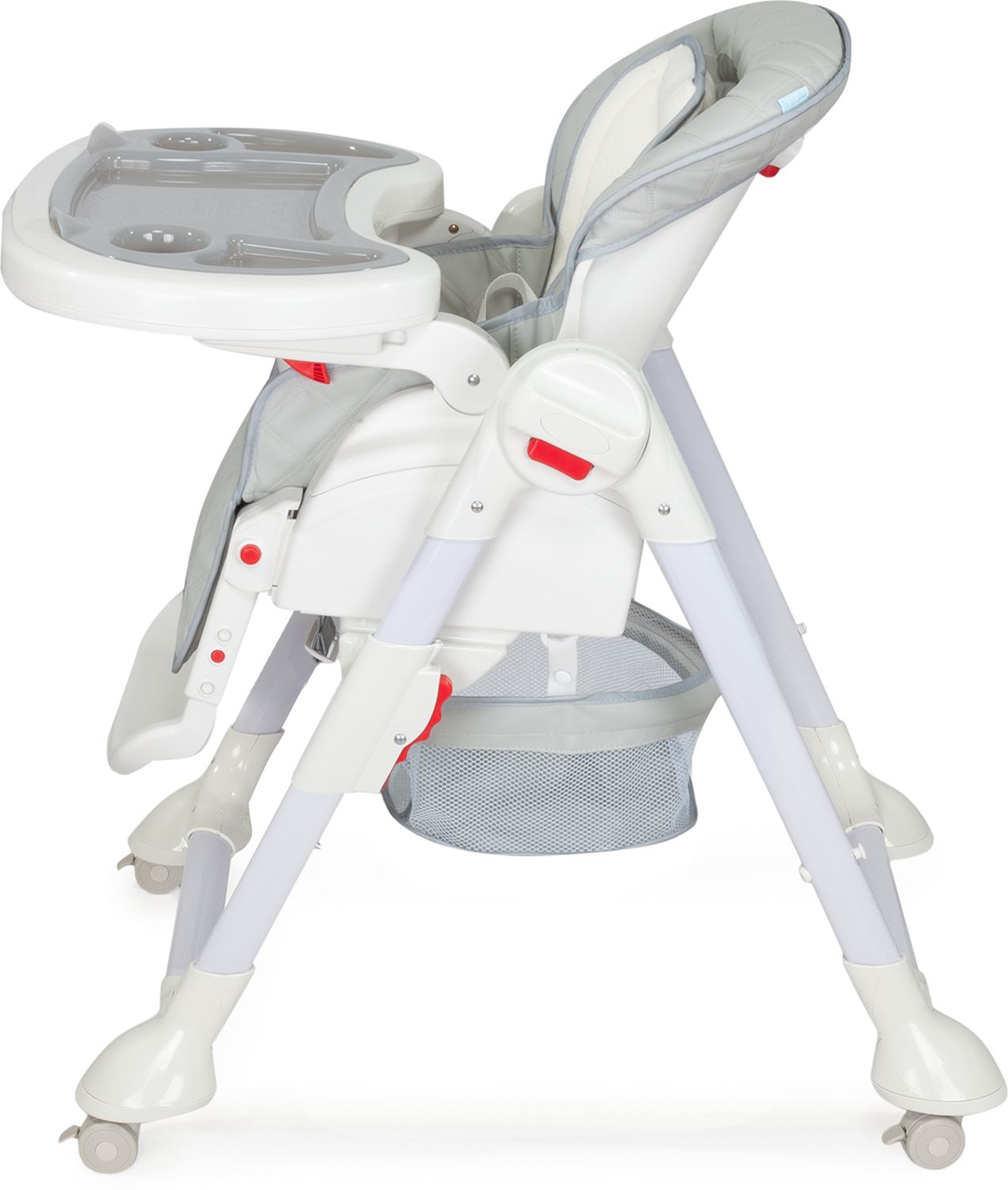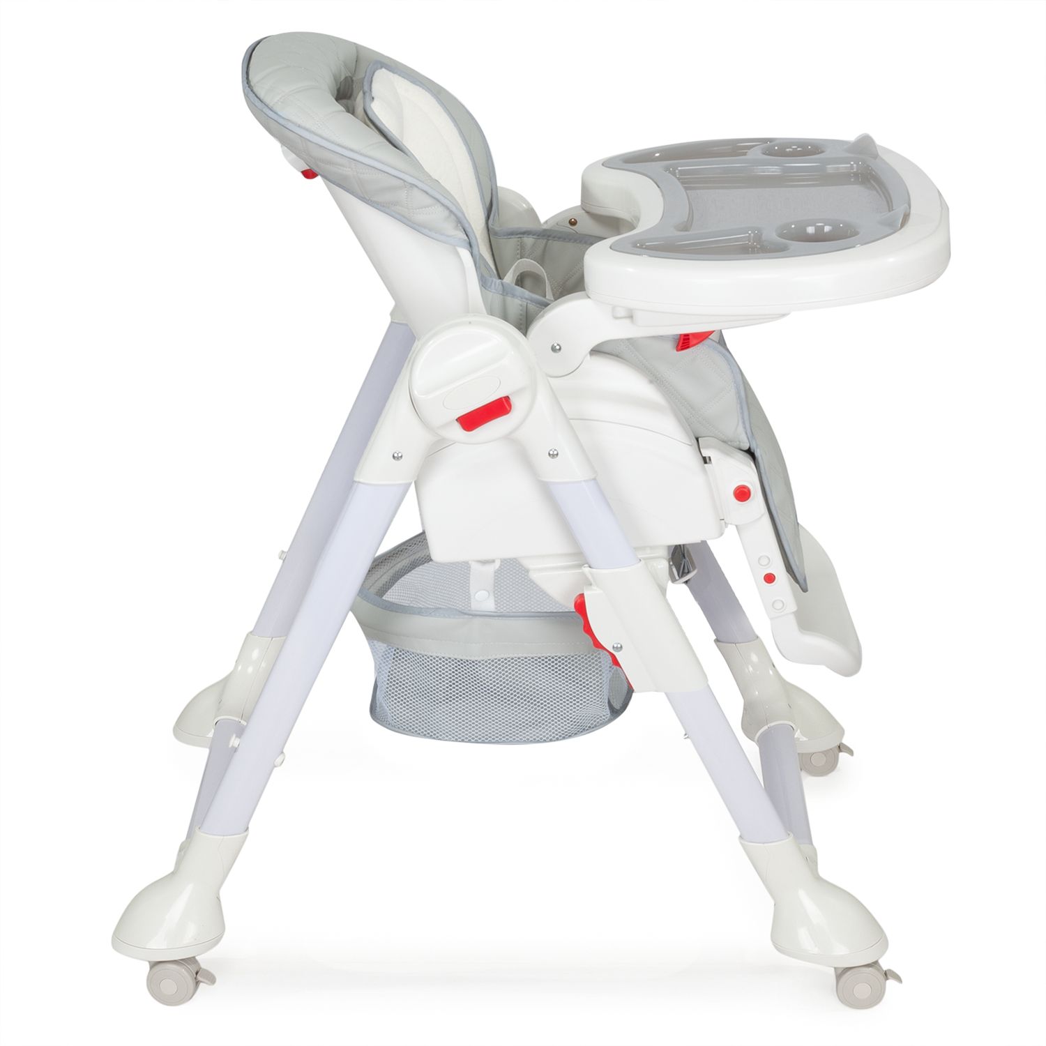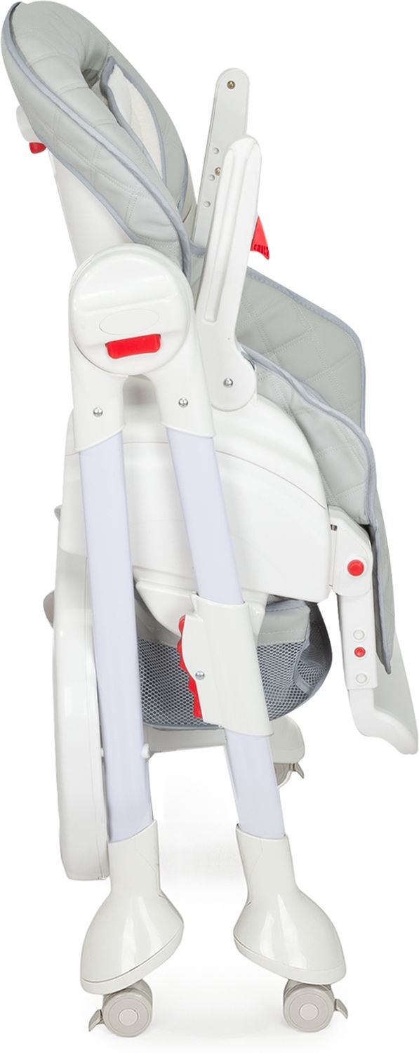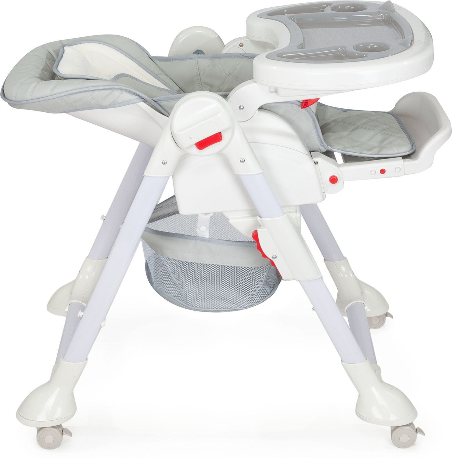 Сидение выполнено из качественной экокожи, которая прочна и проста в уходе. Отдельного внимания заслуживает стильный европейский дизайн с мягкими цветовыми сочетаниями. Дополнительными преимуществами для владельцев станут такие приятные «мелочи», как съёмный поднос с углублениями для чашек и бутылочек; корзинка для игрушек; поворотные колеса с надежной фиксацией и возможность хранения в сложенном виде без посторонней опоры.