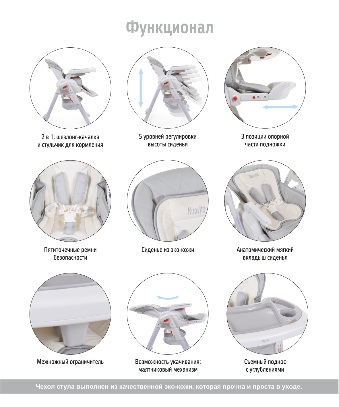 Приятные особенности :Эта универсальная модель объединяет в своей конструкции двойной функционал: это и шезлонг-качалка для новорожденного, и стульчик, в котором удобно кормить подросшего малыша. В возрасте от 0 до 6 месяцев стул-шезлонг для кормления Nuovita Tutela можно использовать в качестве шезлонга, для чего предусмотрены следующие особенности: