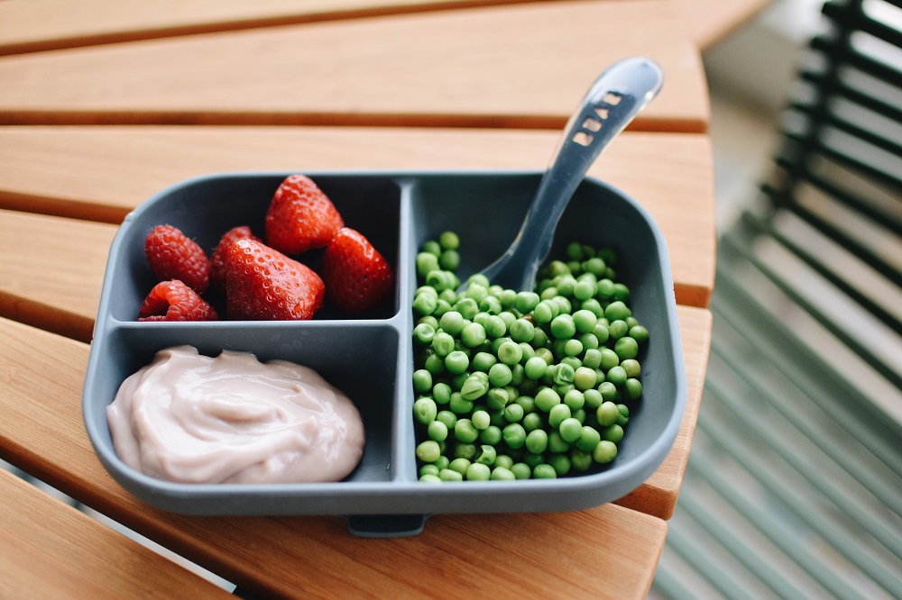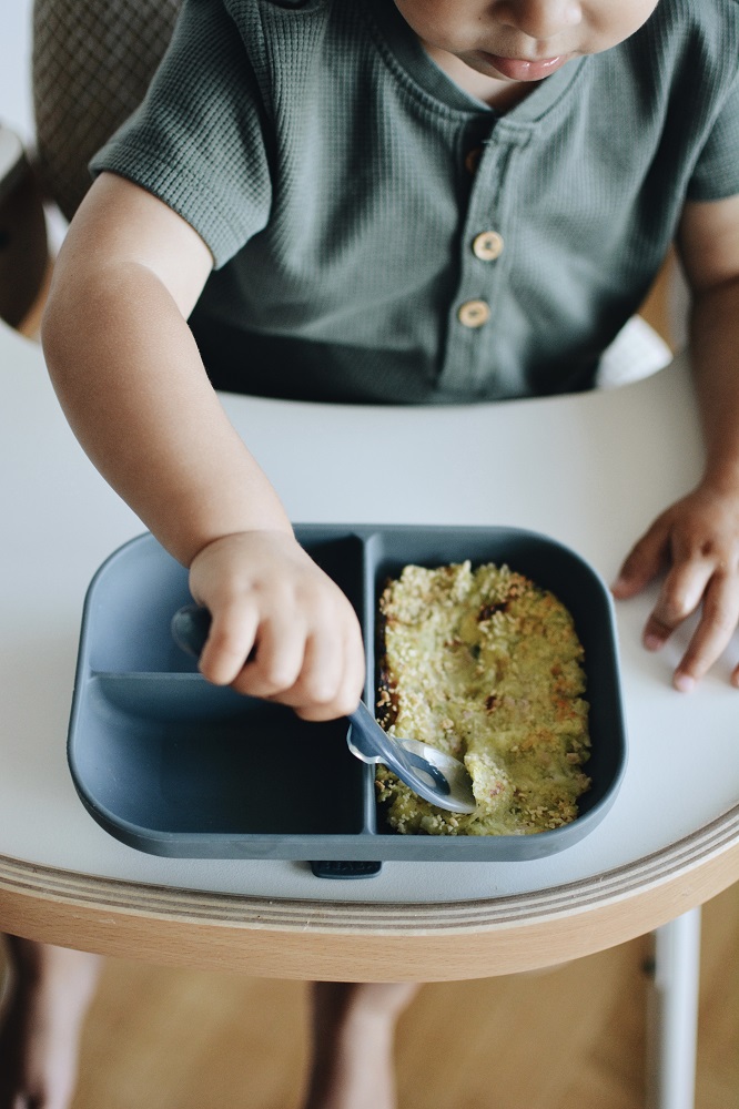• тарелка из силикона с присоской и отделениями, чтобы научиться есть, не проливая