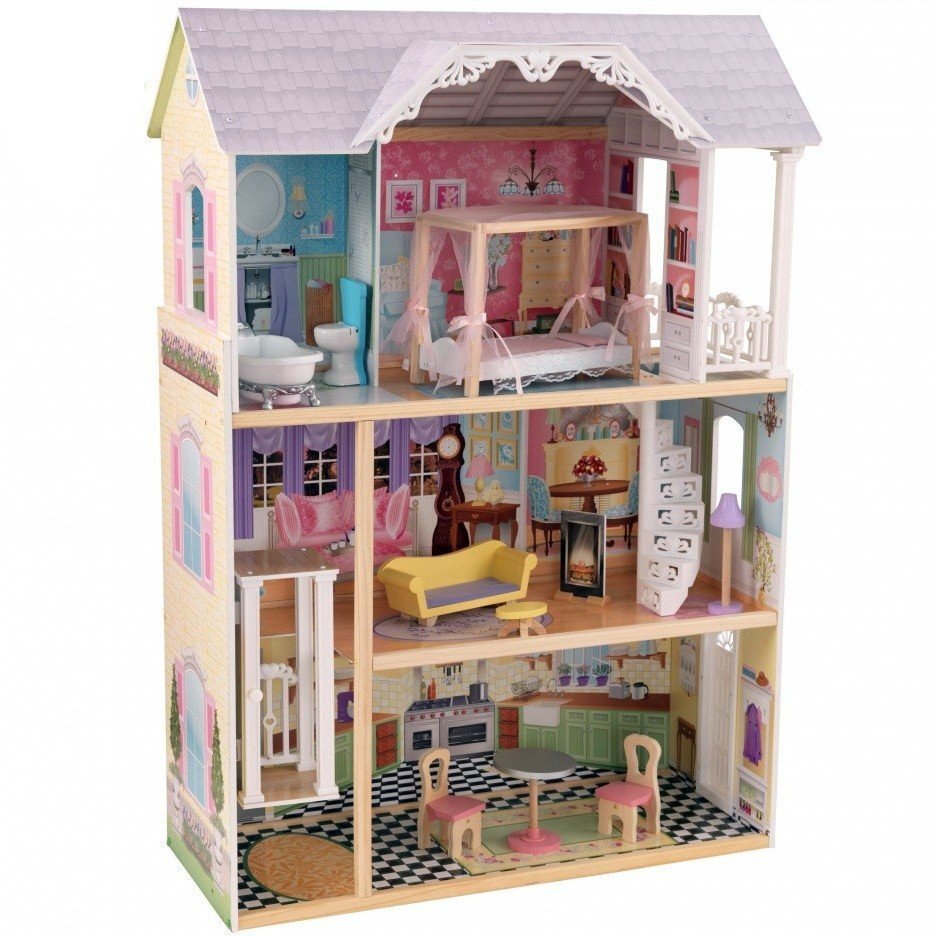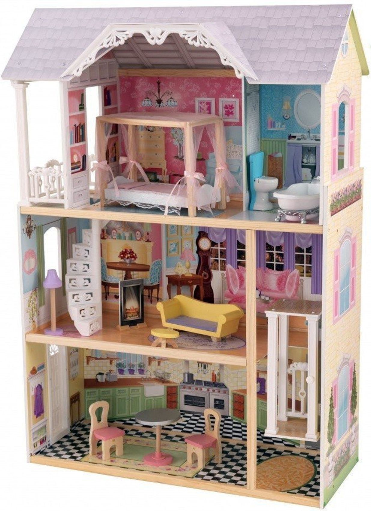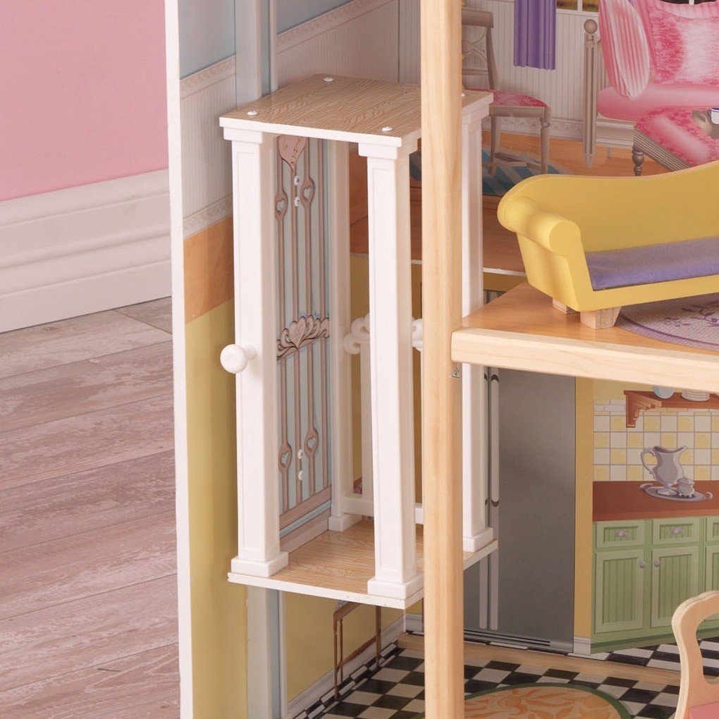 Приятные особенности кукольного домика с мебельюKidKraft "Кайли": э тот просторный 3-х этажный домик позволяет разместить куклы Барби, Мокси, Братц высотой до 30 см. Он станет замечательным презентом для девчонок от 3 до 8 лет. Домик изготовлен в классическом стиле. Сочетает в себе нежные светлые тона. В наборе имеются 10 предметов мебели и различные аксессуары. Коттедж оснащен лестницей, большим лифтом.