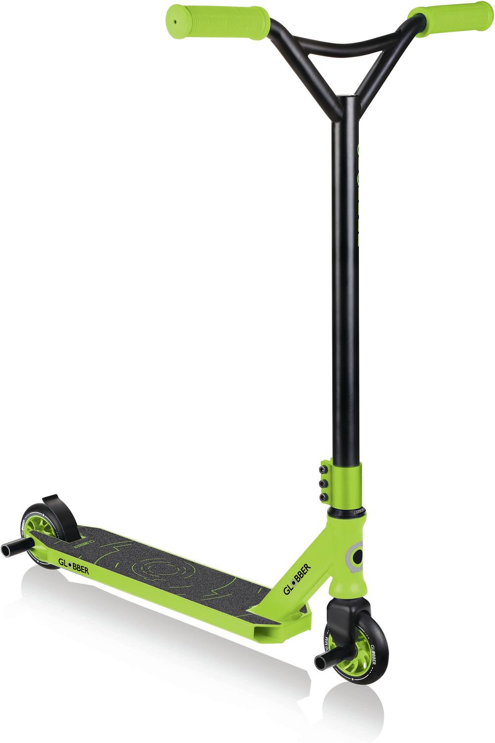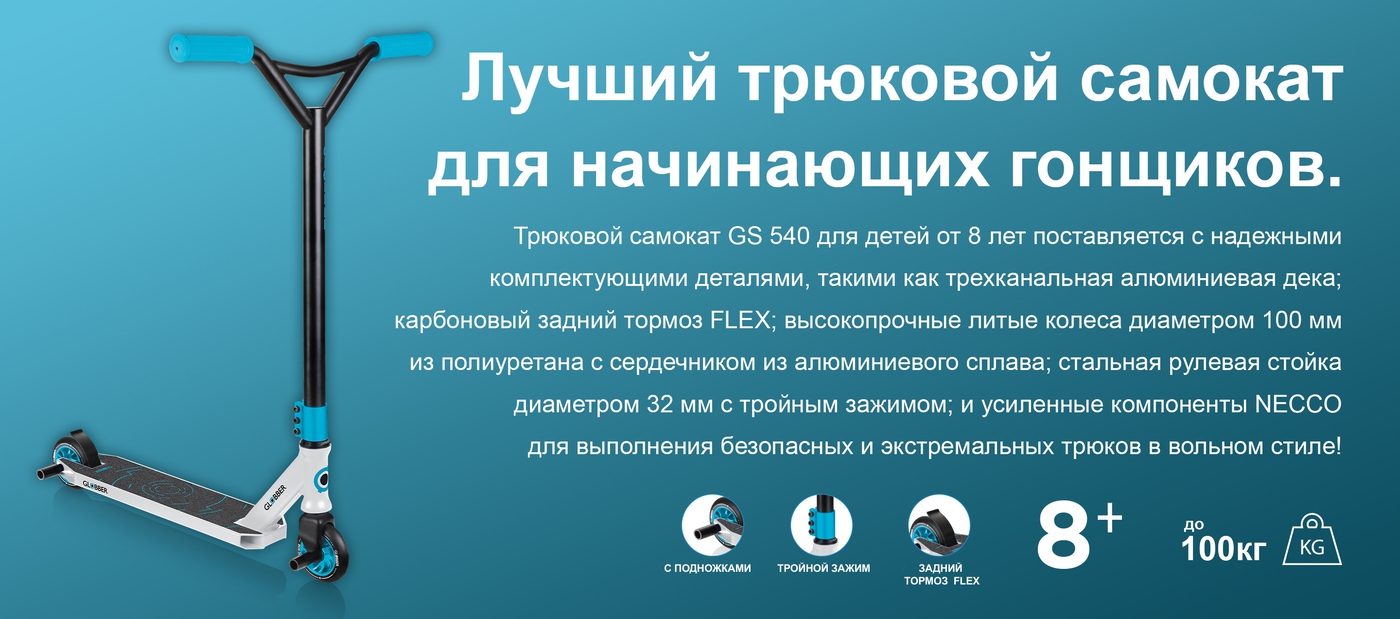 Приятные особенности:Самокат трюковой Globber GS 540° создан для активных детей старше 8 лет. Это продуманная трюковая модель, собранная из прочных элементов. Конструкция способна выдержать нагрузку в 100 кг. Дека шириной в 11.5 см оснащена прорезиненной антискользящей поверхностью. Встроенный задний тормоз позволяет контролировать движение. Y-образный руль с усиленной перемычкой удобен в управлении. Самокат оборудован 2 полиуретановыми колесами диаметром 100 мм. Небольшой вес 3,72 кг позволяет быстро разгоняться и безопасно приземляться.