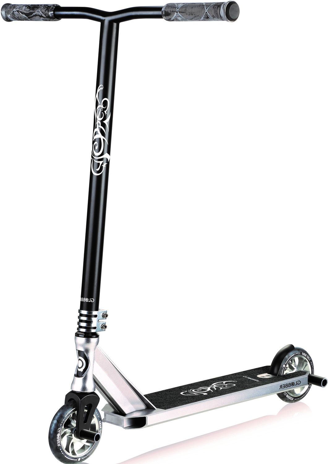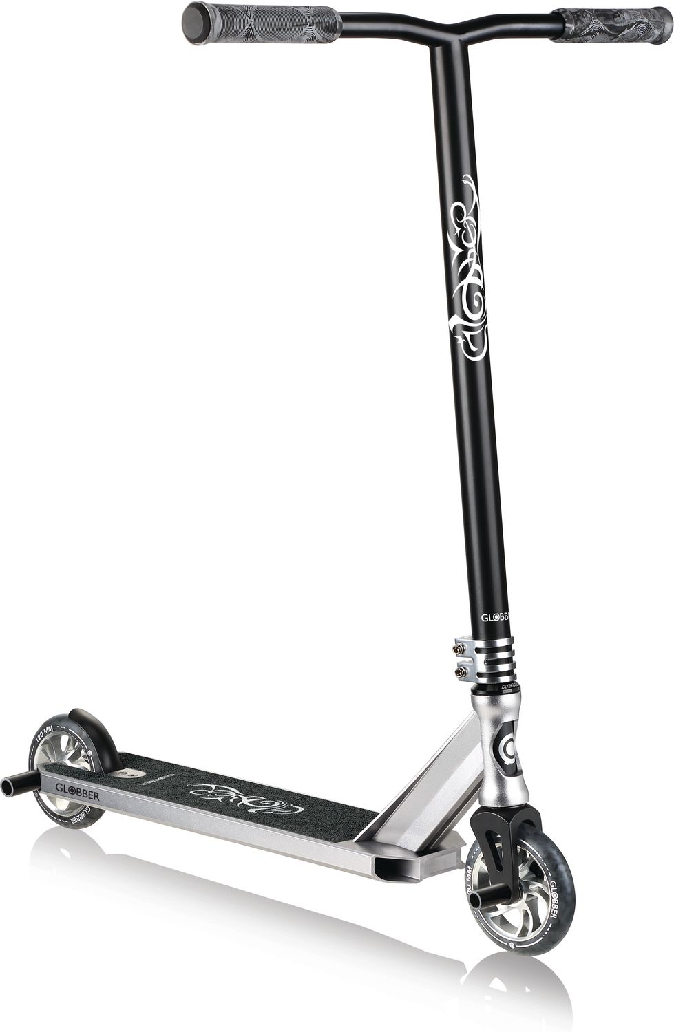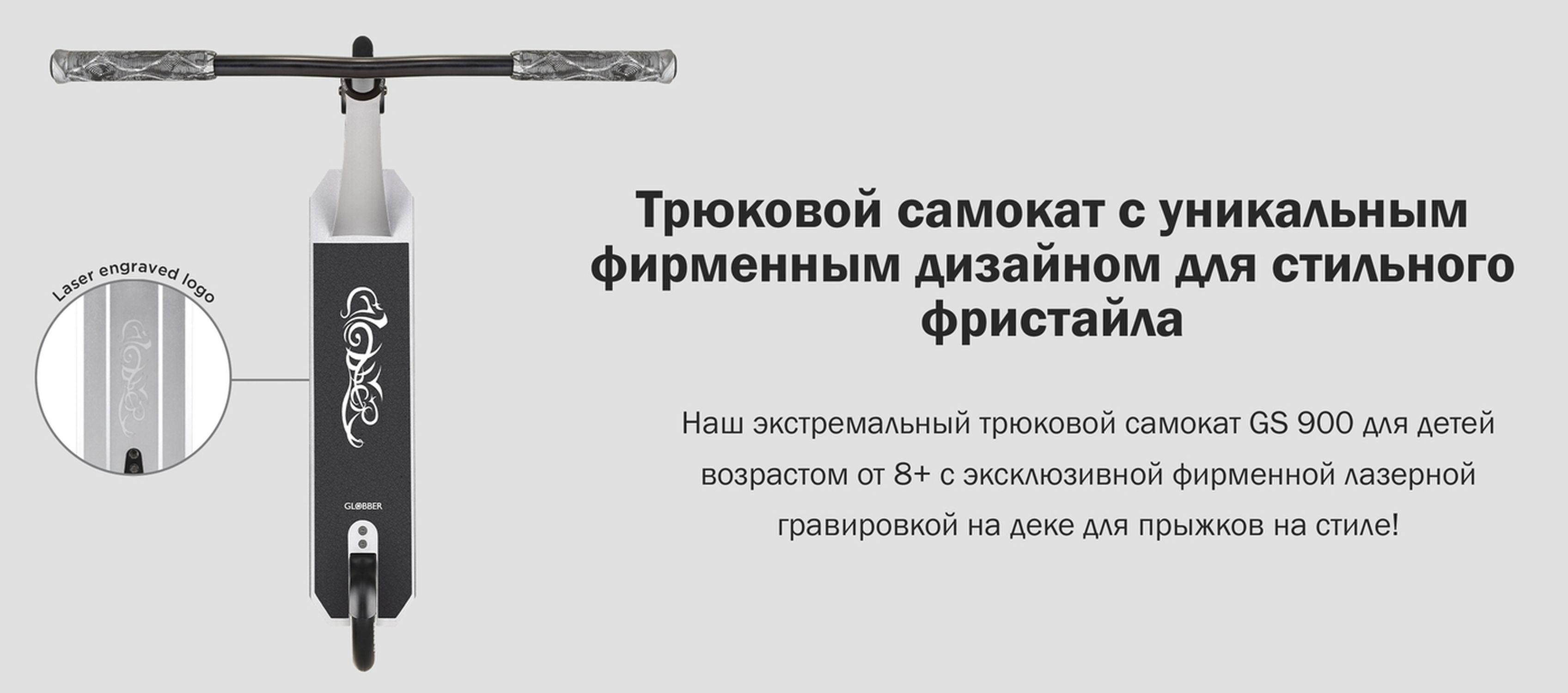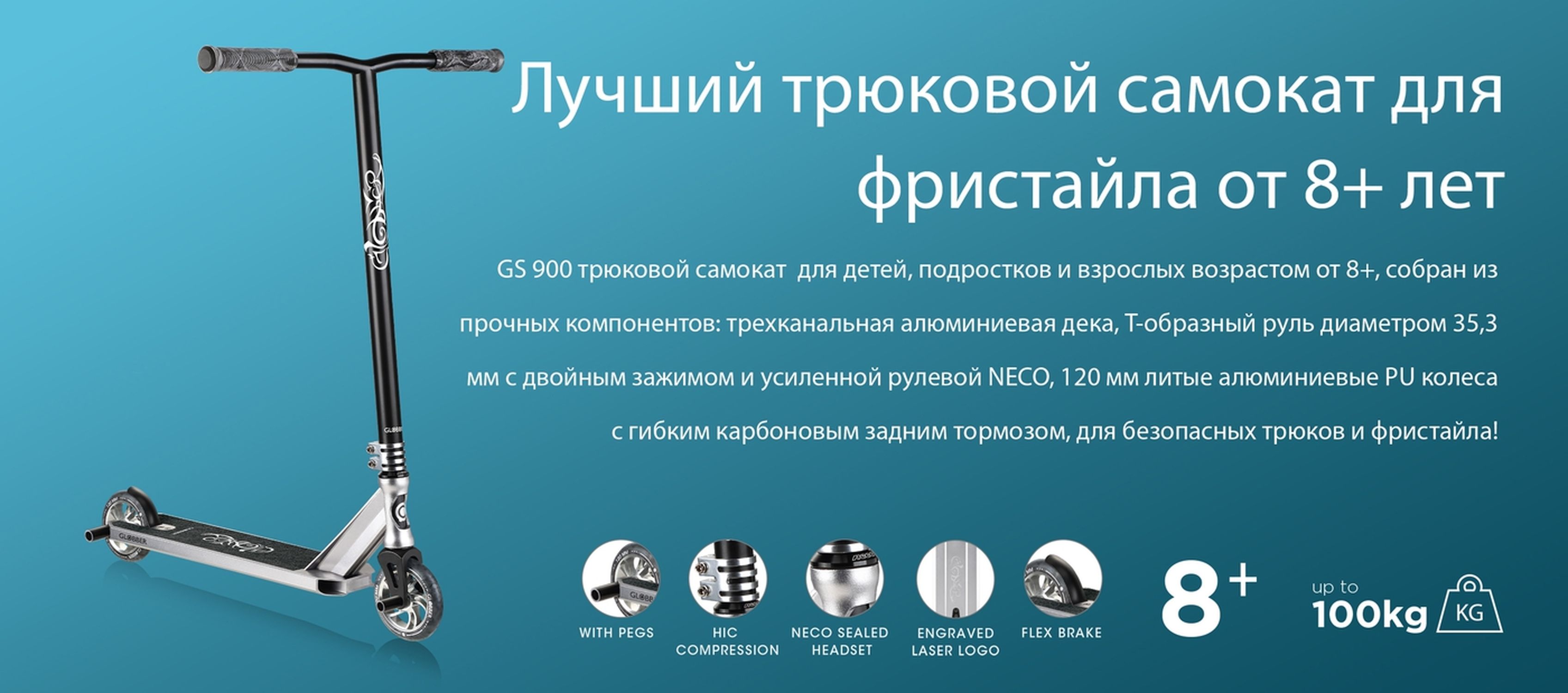Приятные особенности: Трюковой самокат Globber GS 900 — один из лучших представителей экстремальной линейки Globber. Все его характеристики говорят об этом. Прочная металлическая дека выполнена из алюминия Т6. Конкейв 2 градуса позволяет снизить динамическую нагрузку на самокат, делая снаряд долговечным и более выносливым для выполнения трюков. Габариты платформы делают эту модель удобной для упражнений во фристайле. Прямой Т-образный руль с TRP 165 мм грипсами гарантирует уверенное управление самокатом во время езды и при выполнении трюков. Благодаря небольшому весу и высокой маневренности этот самокат рекомендован детям с 8 лет.