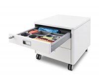Приятные особенности:Тумба Cubic представляет собой систему хранения, оснащенную тремя выдвижными ящиками. Первое отделение запирается на ключ и снабжено удобными разделителями для содержания различных школьных принадлежностей, материалов для творчества и других мелочей. Два других ящика оснащены доводчиками, что делает их ход легким и плавным. В этих отделениях ребенок сможет хранить другие необходимые для домашних занятий предметы, даже папки формата А3. Мобильность тумбы обеспечивается за счет четырех роликов-опор, благодаря которым мебель можно без труда перемещать в нужное место. На двух передних колесах имеются ограничители – с их помощью модель можно сделать стационарной.Прекрасно вписаться в интерьер детской комнаты и создать настроение тумбе Cubic позволяют сменные аппликации, представленные в 8 цветах, которые входят в стандартную комплектацию к изделию.