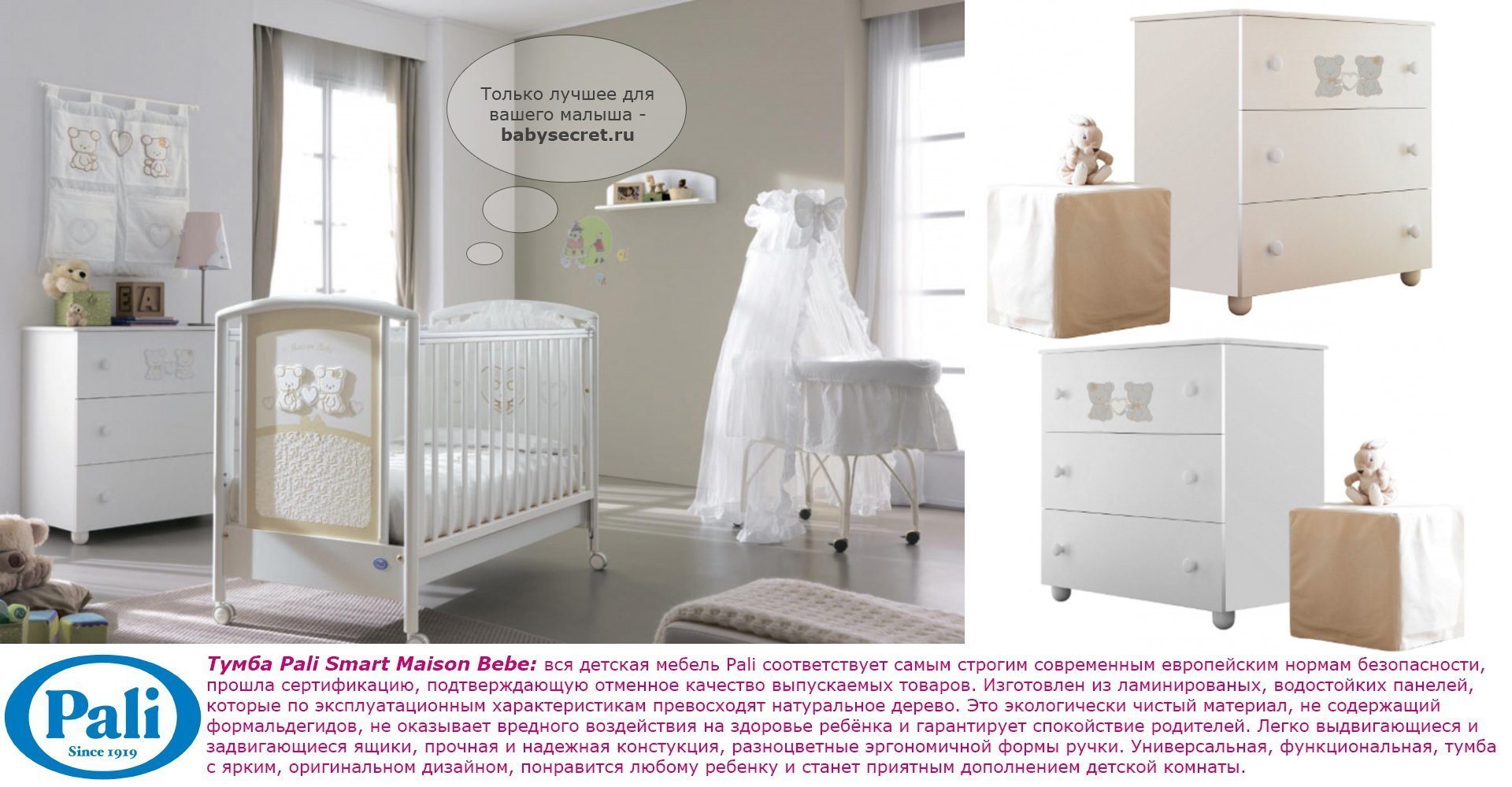 Приятные особенности тумбы Pali Smart Maison Bebe:вся детская мебель Pali соответствует самым строгим современным европейским нормам безопасности, прошла сертификацию, подтверждающую отменное качество выпускаемых товаров. Изготовлен из ламинированых, водостойких панелей, которые по эксплуатационным характеристикам превосходят натуральное дерево. Это экологически чистый материал, не содержащий формальдегидов, не оказывает вредного воздействия на здоровье ребёнка и гарантирует спокойствие родителей. Легко выдвигающиеся и задвигающиеся ящики, прочная и надежная констукция, разноцветные эргономичной формы ручки. Универсальная, функциональная, тумба с ярким, оригинальном дизайном, понравится любому ребенку и станет приятным дополнением детской комнаты.