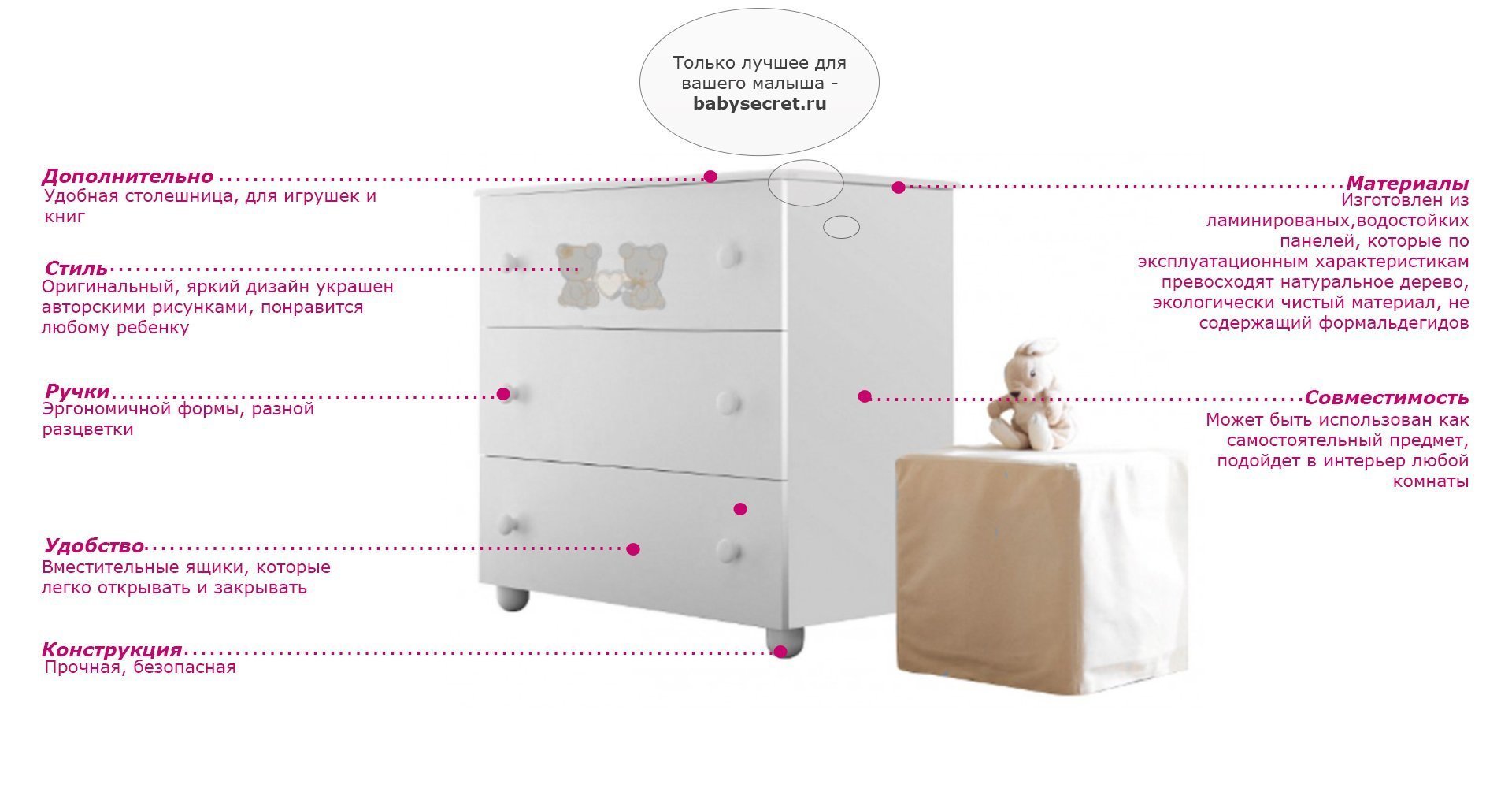 Материалы: изготовлен из ламинированых,водостойких панелей, которые по эксплуатационным характеристикам превосходят натуральное дерево экологически чистый материал, не содержащий формальдегидов полностью безопасные для детей