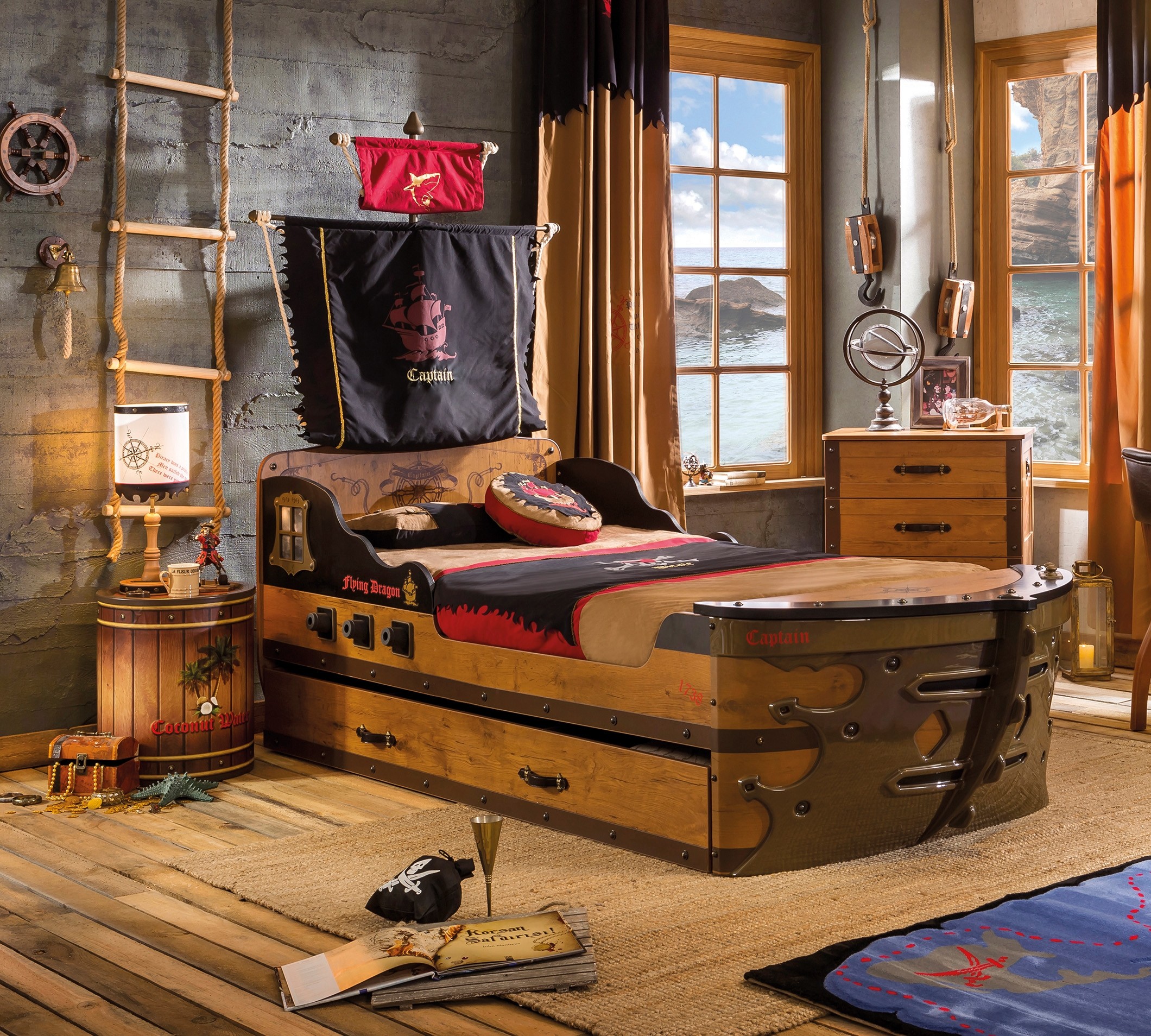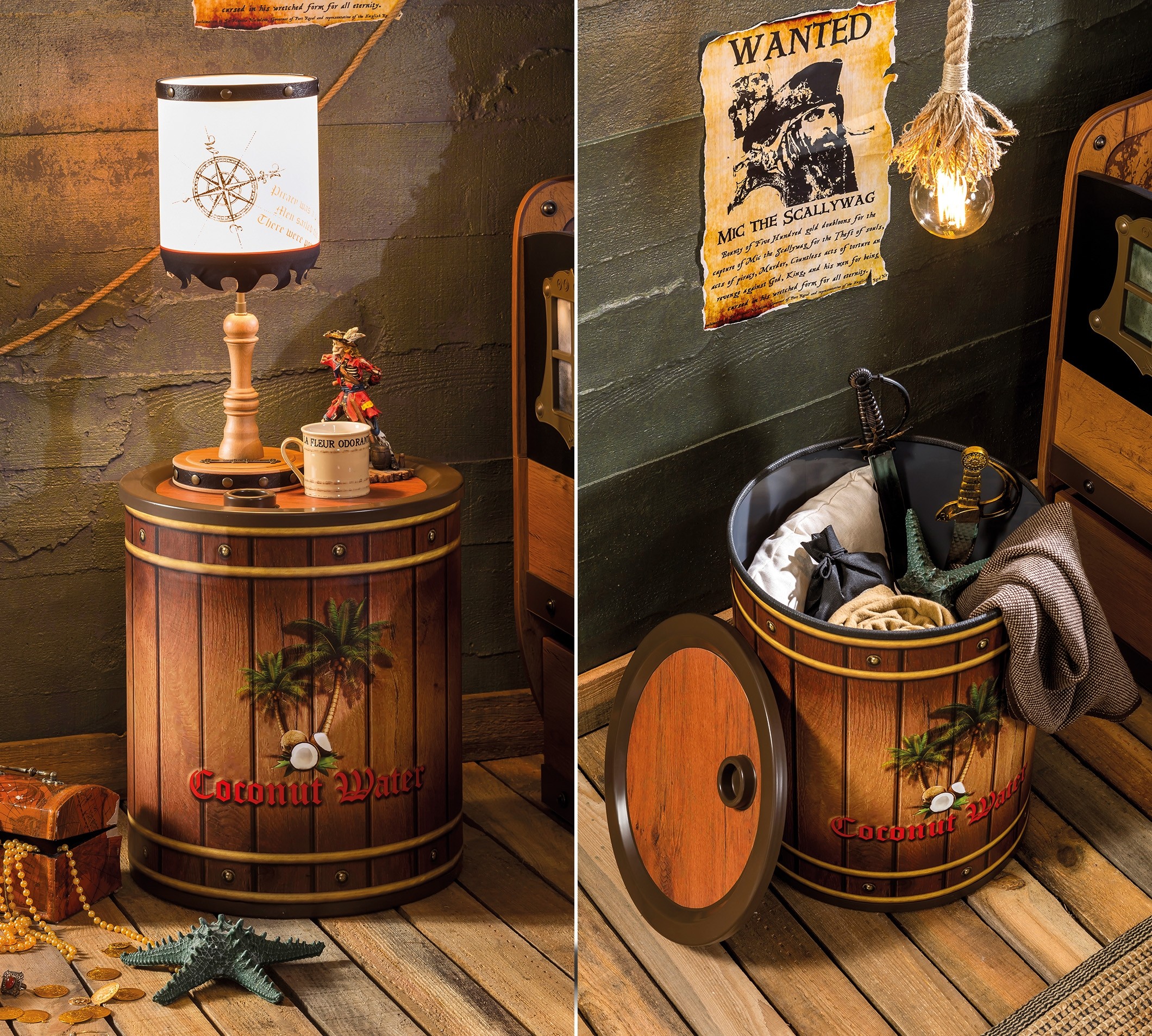 Приятные особенности:Если ваш ребенок очень любит истории о пиратах, фанат фильмов «Пираты Карибского моря» –то возможно, хорошим выбором будет поставить ему в комнату прикроватную тумбочку от Cilek, внешне похожую на деревянную бочку с корабля пиратов. Особенно хорошо она будет смотреться в комнате, что стилизована под пиратскую тематику. Кроме того, что бочка очень вместительная, она компактная и не займет много места. В нее можно складывать игрушки, белье, домашнюю обувь и другие крупные или маленькие вещи. Такие тумбы привлекательные тем, что помогают приучить ребенка к чистоте в комнате. Из-за внешнего вида, ему всегда будет хотеться что-то туда складывать, вытаскивать, открывать и закрывать бочку. Также она может стать неплохой игрушкой, если ваш ребенок представляет себя пиратом. Такая декоративная вещь поможет ему визуализировать свои фантазии. Он может представлять, что в бочке содержатся припасы на его пиратском корабле и т.д. Также у бочки прочная и большая крышка, которая будет выступать и хорошей полочкой для небольших вещей.