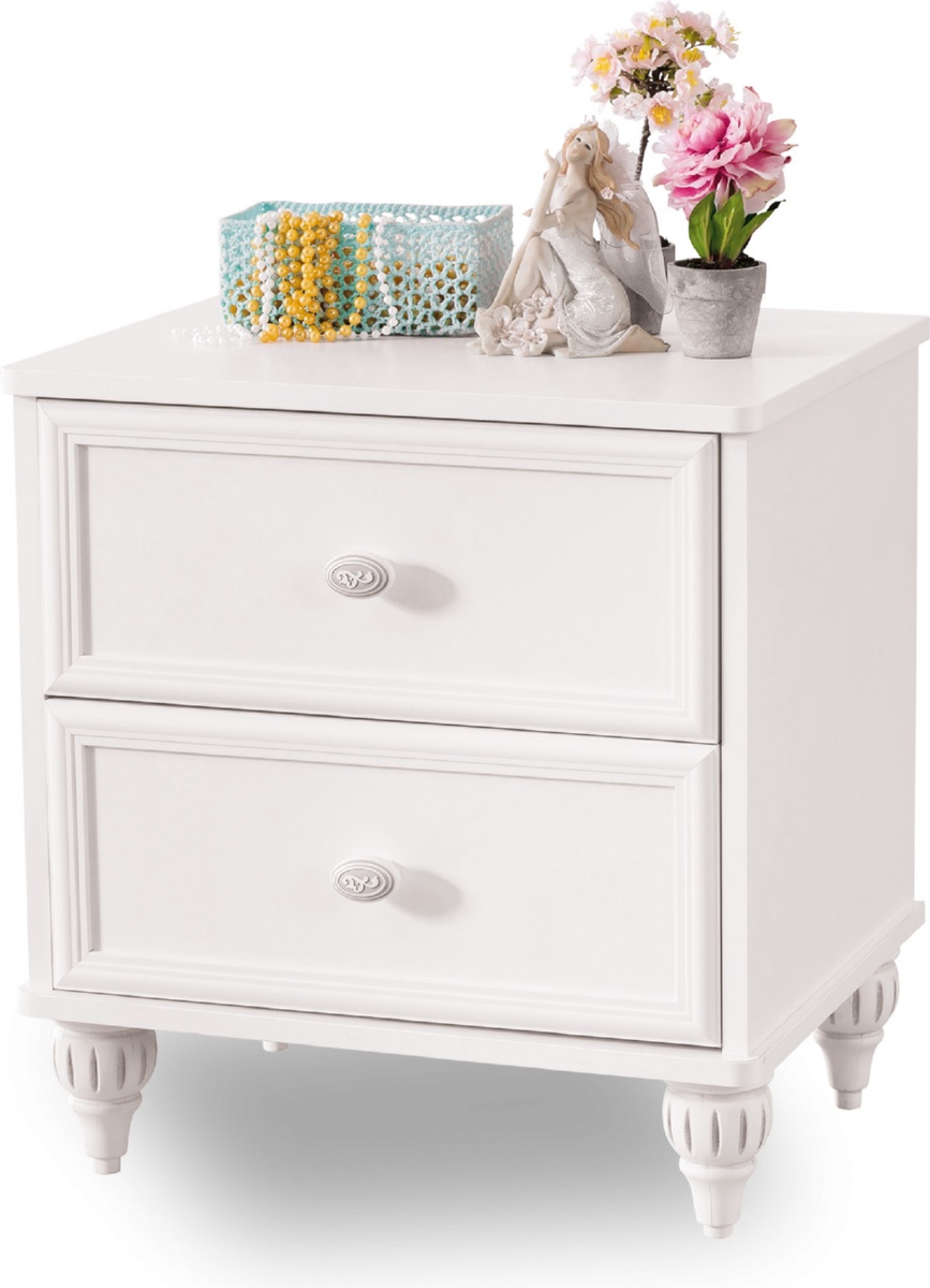 Приятные особенности:Тумбочка Romantic ST выполнена в классическом стиле с элементами викторианского направления, своим видом напоминает что-то изысканное, королевское, в то же время достаточно уютное и нежное. Белый цвет отделки и матовая поверхность покрытия обеспечивают отличное сочетание для спальни, особенно оформленной в стиле шебби шик, как это показано на фотографии. Тумбочка имеет выразительную, но не навязчивую для глаз фигурную резьбу на ножках, ящиках. Это не создает эффекта тяжести от виды мебели, и в то же время разбавляет типичную стандартность. Прикроватная тумбочка данной модели практична и функциональна. Она небольшого размера, имеет два ящика, выдвигаемых при помощи современной прочной фурнитуры. Они вместительные, пространства достаточно для размещения всех необходимых вещей, которые используют перед сном или по утрам. (например, книги, мелкие вещи, мобильное устройство). Небольшая столешница вмещает декоративные украшения комнаты (вазы для цветов, статуэтки), а также светильник, другие предметы. Высота не превышает размер кровати, удобно достать рукой что-то не поднимаясь с постели.
