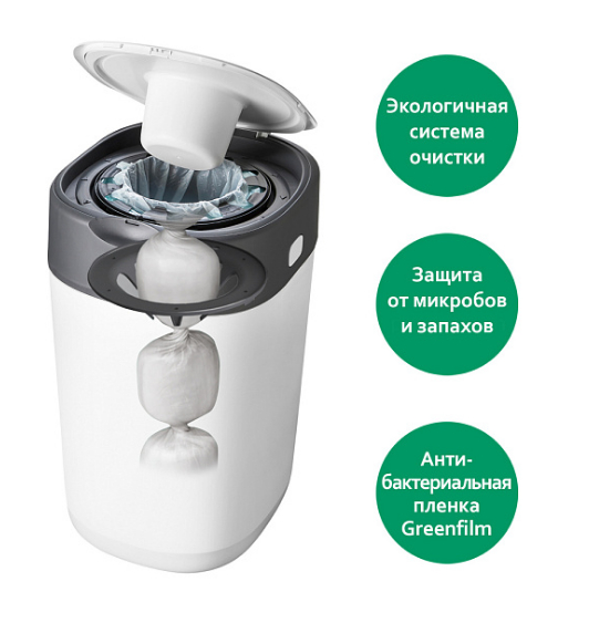 Приятные особенности:Утилизатор для использованных подгузников Twist & Click — единственный в мире накопитель для использованных подгузников, который может скручивать и индивидуально заворачивать каждый подгузник, надежно изолируя запахи и сохраняя Ваш дом в свежести и чистоте. Для работы утилизатора необходимы кассеты. Сменная касета -Этомногослойный антибактериальный материал GREENFILM™ в 100 раз эффективнее обычных пакетов для подгузников, поскольку он защищен биоцидом серебра Biomaster (антибактериальная защита присутствует только в пленке. Пленка обработана биоцидом серебра Biomaster, протестированным в соответствии с ISO 22196-2011) и уничтожает 99 % опасных микробов, таких как E-coli и Staphylococcus Aureus. Умная герметичная крышка задерживает все неприятные запахи, а встроенный поршень проталкивает подгузники глубоко в утилизатор, сохраняя ваши руки в чистоте.