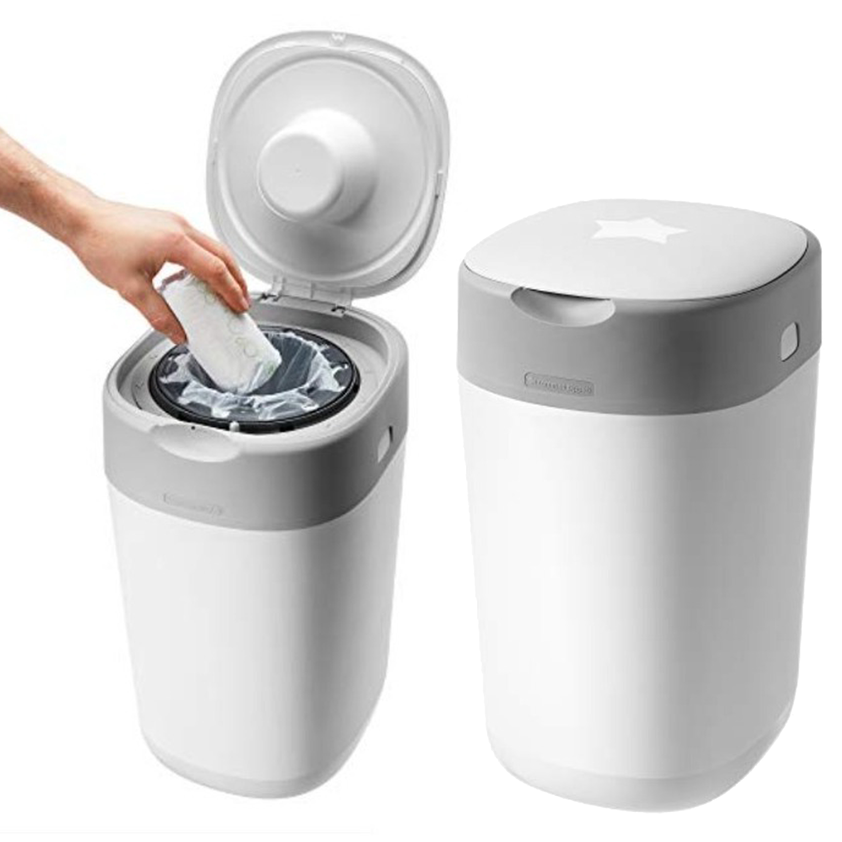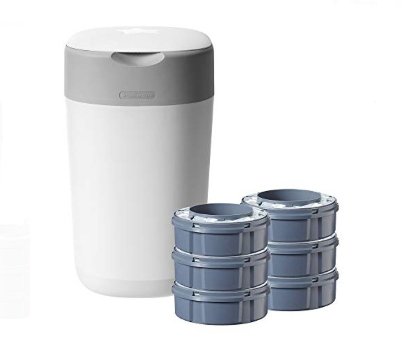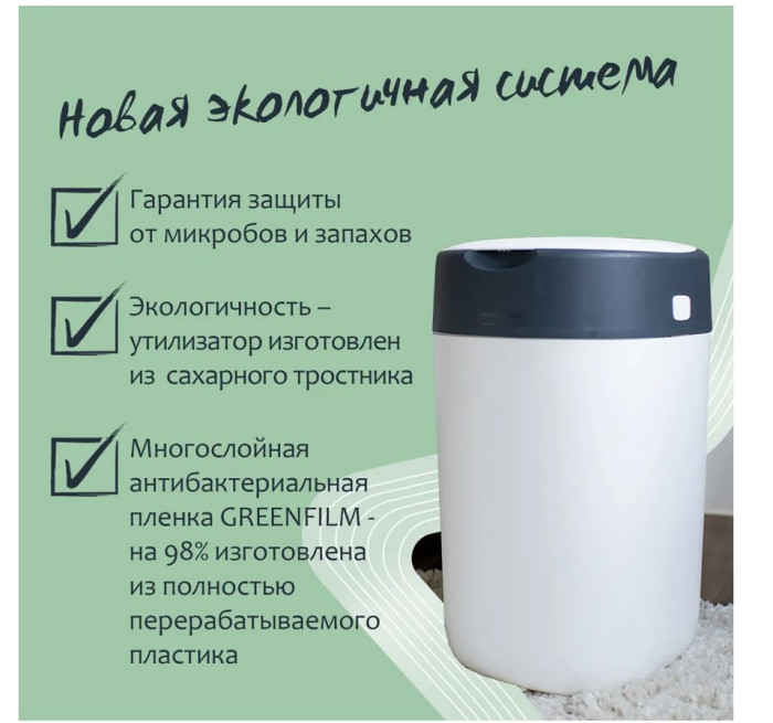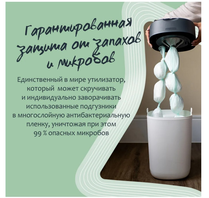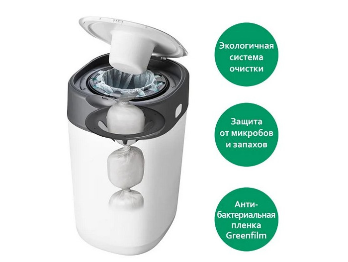 Приятные особенности: Утилизатор для использованных подгузников Twist & Click — единственный в мире накопитель для использованных подгузников, который может скручивать и индивидуально заворачивать каждый подгузник, надежно изолируя запахи и сохраняя Ваш дом в свежести и чистоте. Для работы утилизатора необходимы кассеты. Сменная касета - Э то многослойный антибактериальный материал GREENFILM™ в 100 раз эффективнее обычных пакетов для подгузников, поскольку он защищен биоцидом серебра Biomaster (антибактериальная защита присутствует только в пленке. Пленка обработана биоцидом серебра Biomaster, протестированным в соответствии с ISO 22196-2011) и уничтожает 99 % опасных микробов, таких как E-coli и Staphylococcus Aureus. Умная герметичная крышка задерживает все неприятные запахи, а встроенный поршень проталкивает подгузники глубоко в утилизатор, сохраняя ваши руки в чистоте.