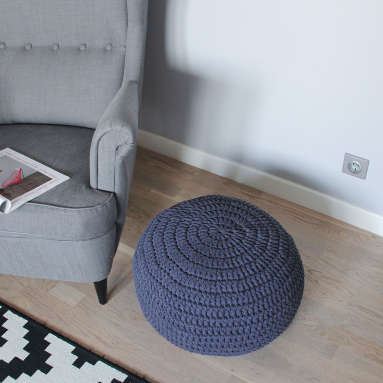 Вязаный пуф внутри набит шариками, а внешний чехол сделан из трикотажной пряжи.