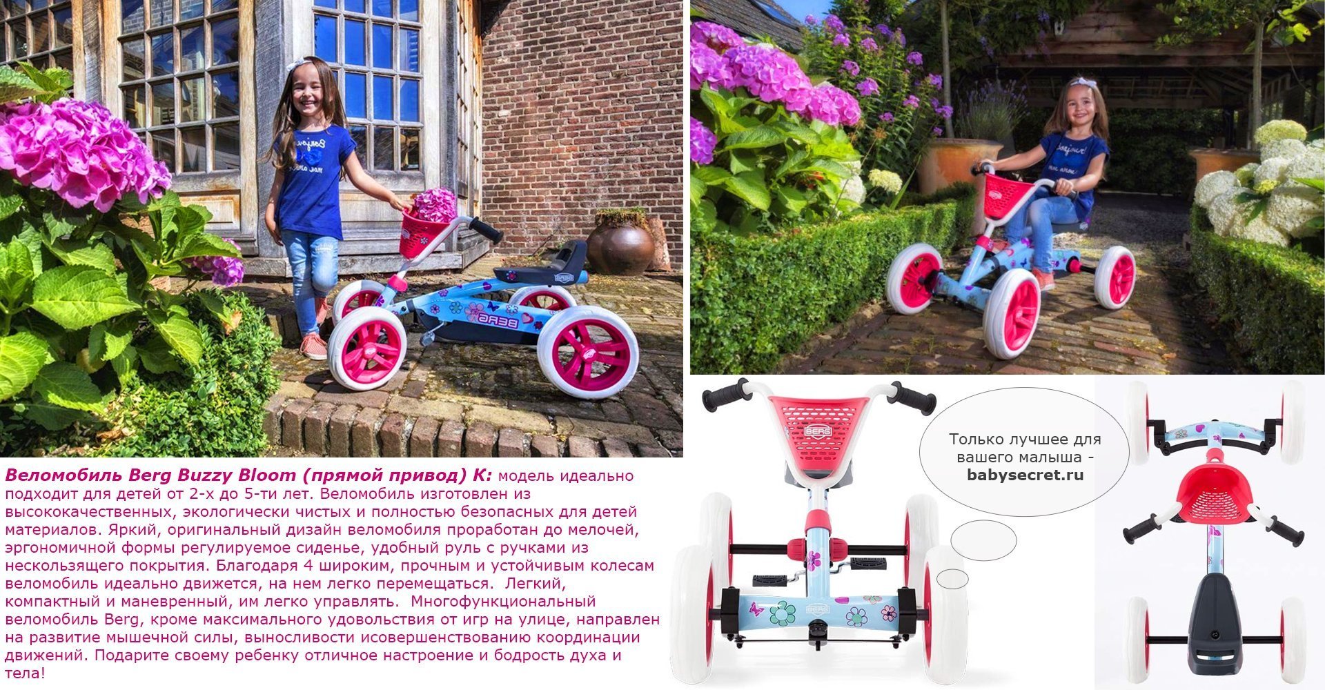 Приятные особенности веломобиля Berg Buzzy Bloom:Ничего себе! Этот розовый детский веломобиль ездит также классно, как он выглядит. Вы можете сами наклеить на него наклейки! И тем самым сделать его неповторимым! Затем вы можете отправиться за покупками с мамой или папой и положить игрушки в свою удобную маленькую корзину! Или вы можете отправиться на пикник в парке. С BERG Buzzy Bloom маленькая леди может ВСЁ!У веломобиля четыре колеса, а значит он гораздо более устойчив, чем трехколесный аналог. Ноги ребенка надежно стоят на педалях даже при крутых поворотах. Размер BERG Buzzy делает его пригодным для использования в помещениях и на открытом воздухе. Даже дождь не помеха для веселой и увлекательной поездки на веломобиле. Веломобиль рассчитан на возрастную группу от 2 до 5 лет.