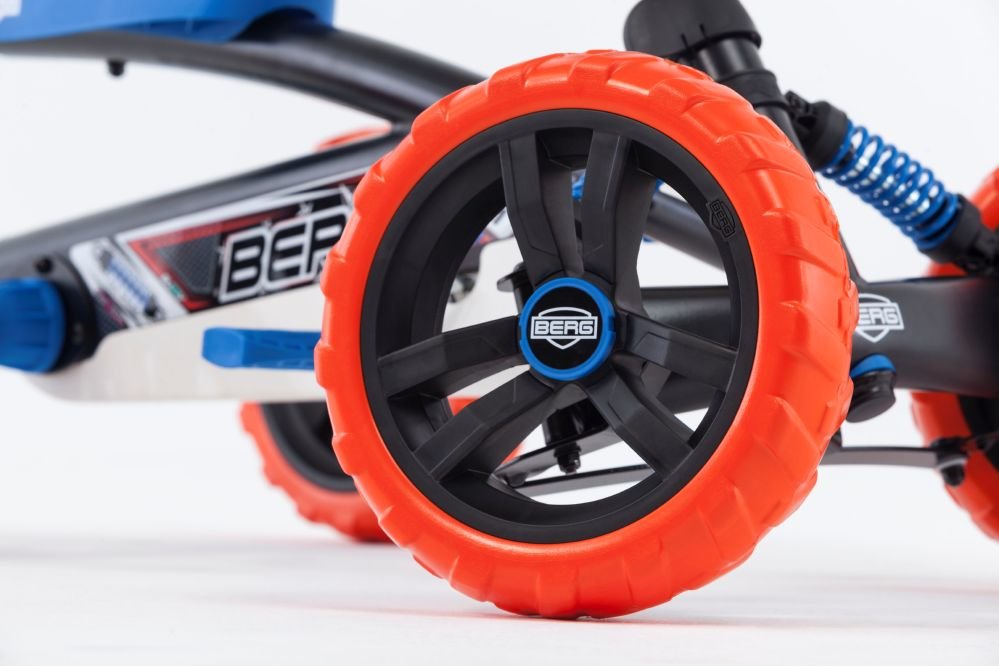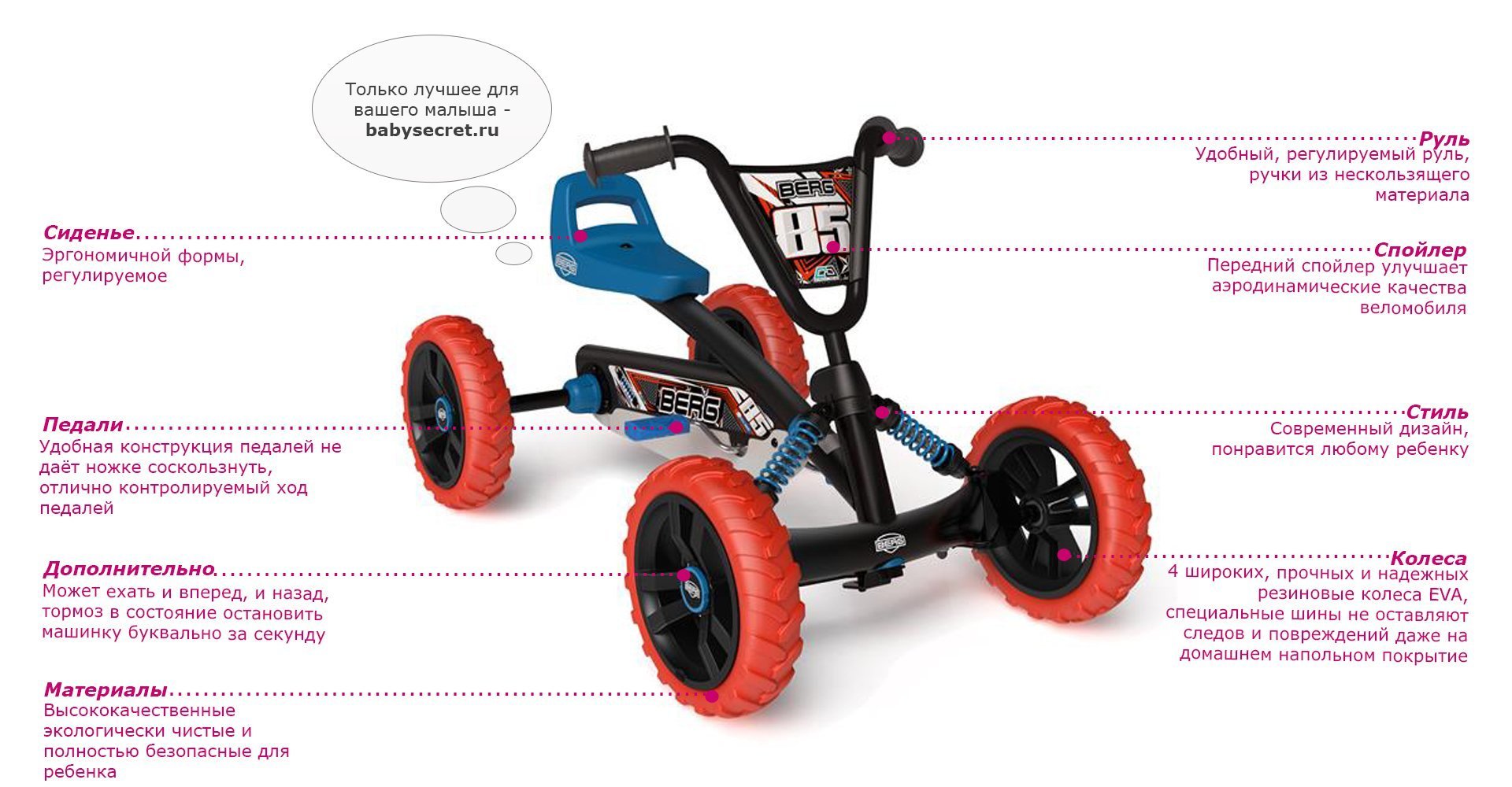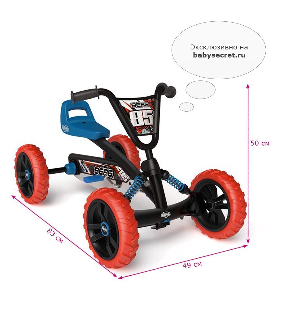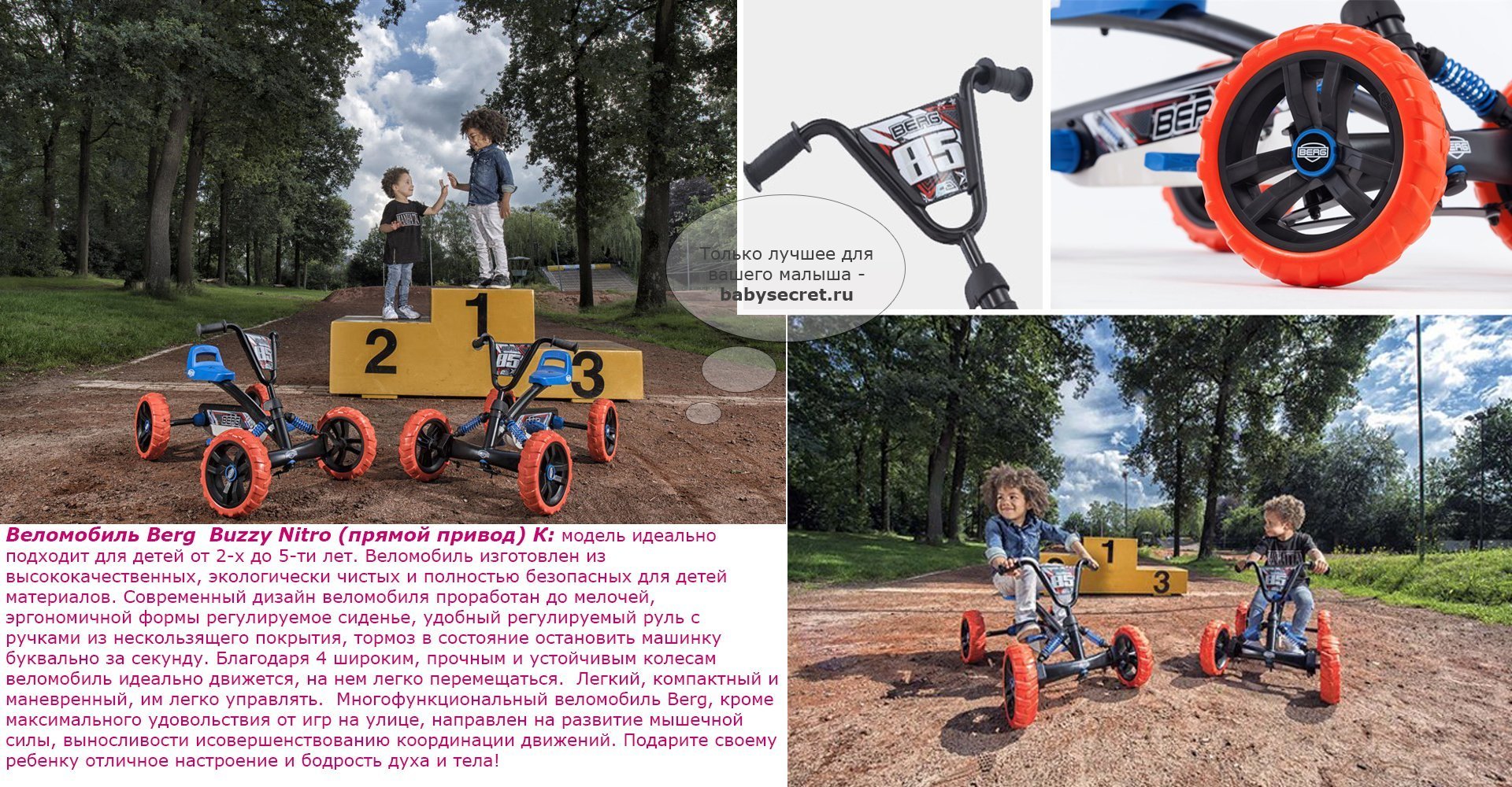 Приятные особенности веломобиля Berg BuzzyNitro(прямой привод) К:Мечтаете о собственном квадроцикле? Какой мальчик или девочка достаточно храбры, чтобы сесть за руль этого веломобиля?! BERG Buzzy Nitro - только для настоящих героев бездорожья! BERG Buzzy со всеми знакомыми функциями, но в суперверсии. Крутые наклейки, потрясающая подвеска и, конечно же, фантастические шины делают этого внедорожного монстра самым крутым детским веломобилем. С ним ваш ребенок станет королём дороги.У веломобиля четыре колеса, а значит он гораздо более устойчив, чем трехколесный аналог. Ноги ребенка надежно стоят на педалях даже при крутых поворотах. Размер BERG Buzzy делает его пригодным для использования в помещениях и на открытом воздухе. Даже дождь не помеха для веселой и увлекательной поездки на веломобиле. Веломобиль рассчитан на возрастную группу от 2 до 5 лет.