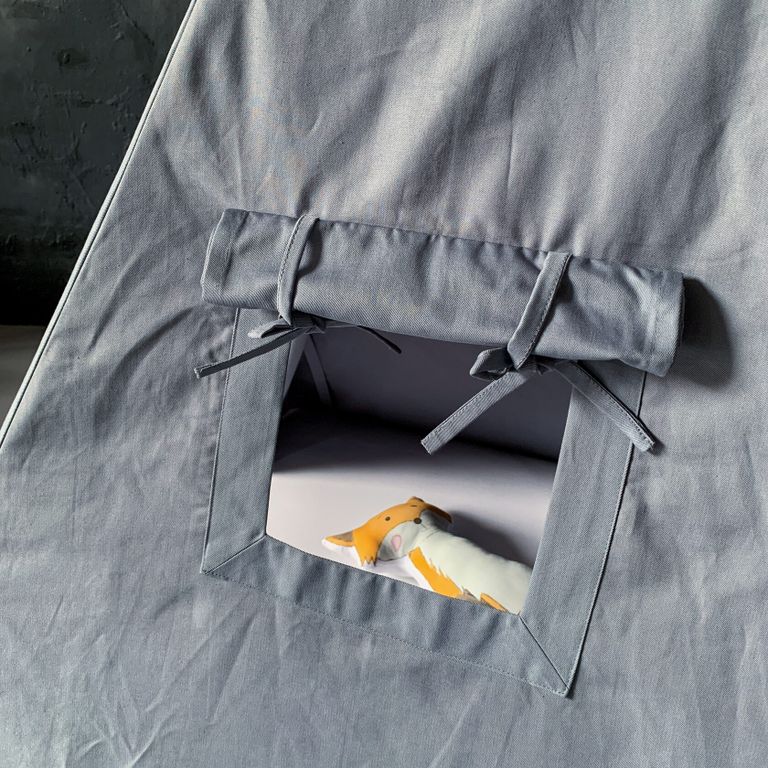 - Чехол для вигвама с завязочками сверху. Если вигвам нужно убрать, его можно убрать в этот чехол. По умолчанию мы шьем белые, черные, синие, розовые и красные чехлы, но можем сшить из любой ткани на ваш выбор. Ткань 100% хлопок.