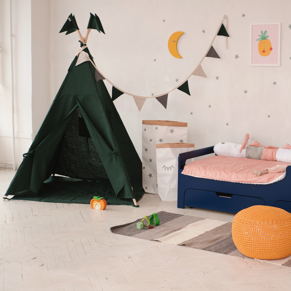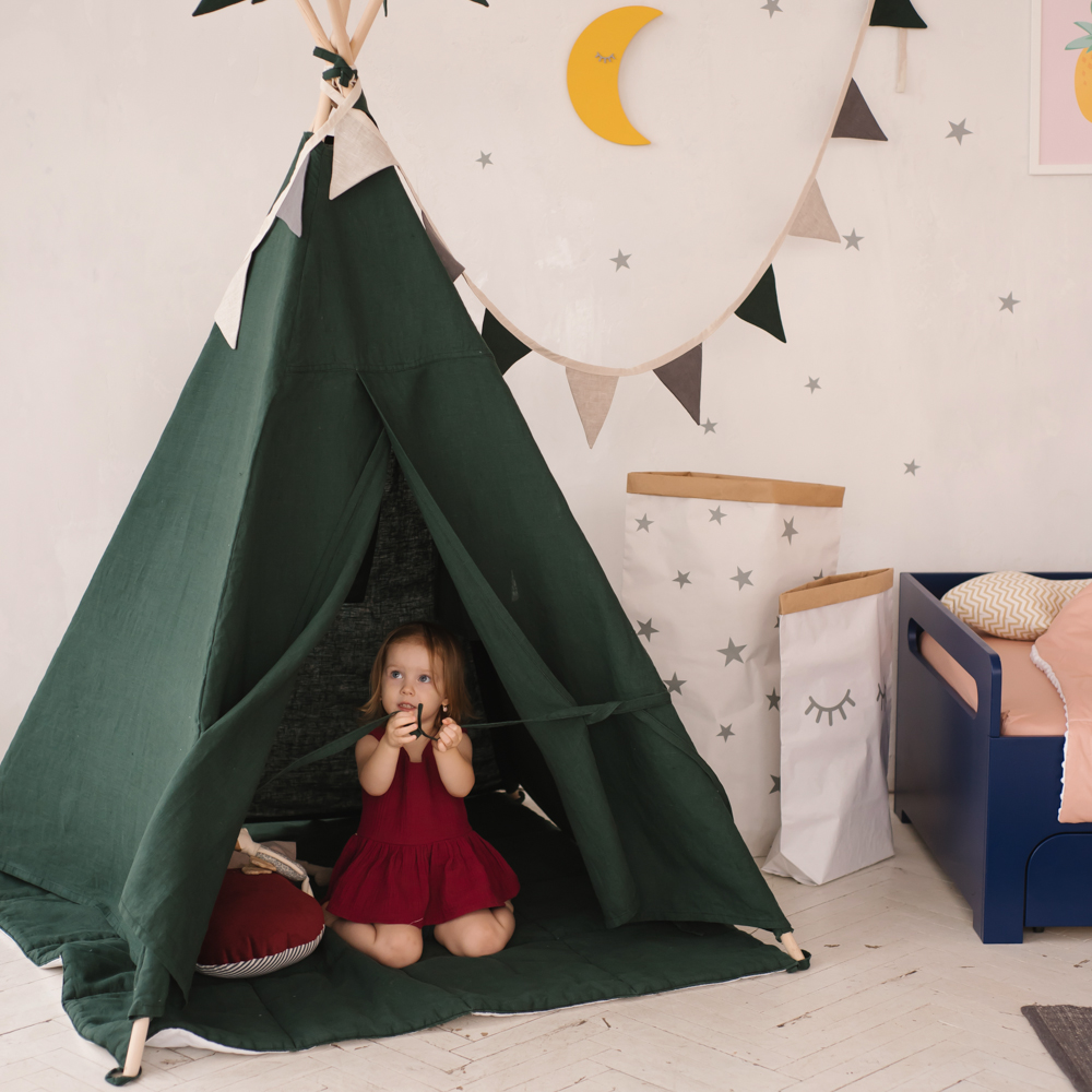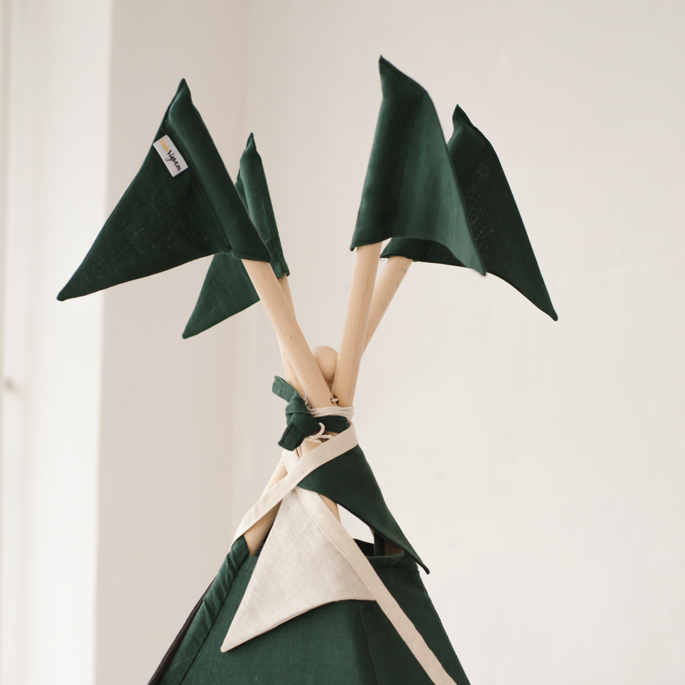 - Гирлянда из 8 тканевых флажков. Еще один декоративный элемент вигвама для детей. Ткань 100% хлопок. Можно выбрать тут.