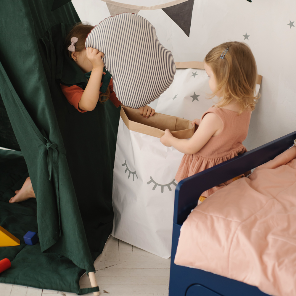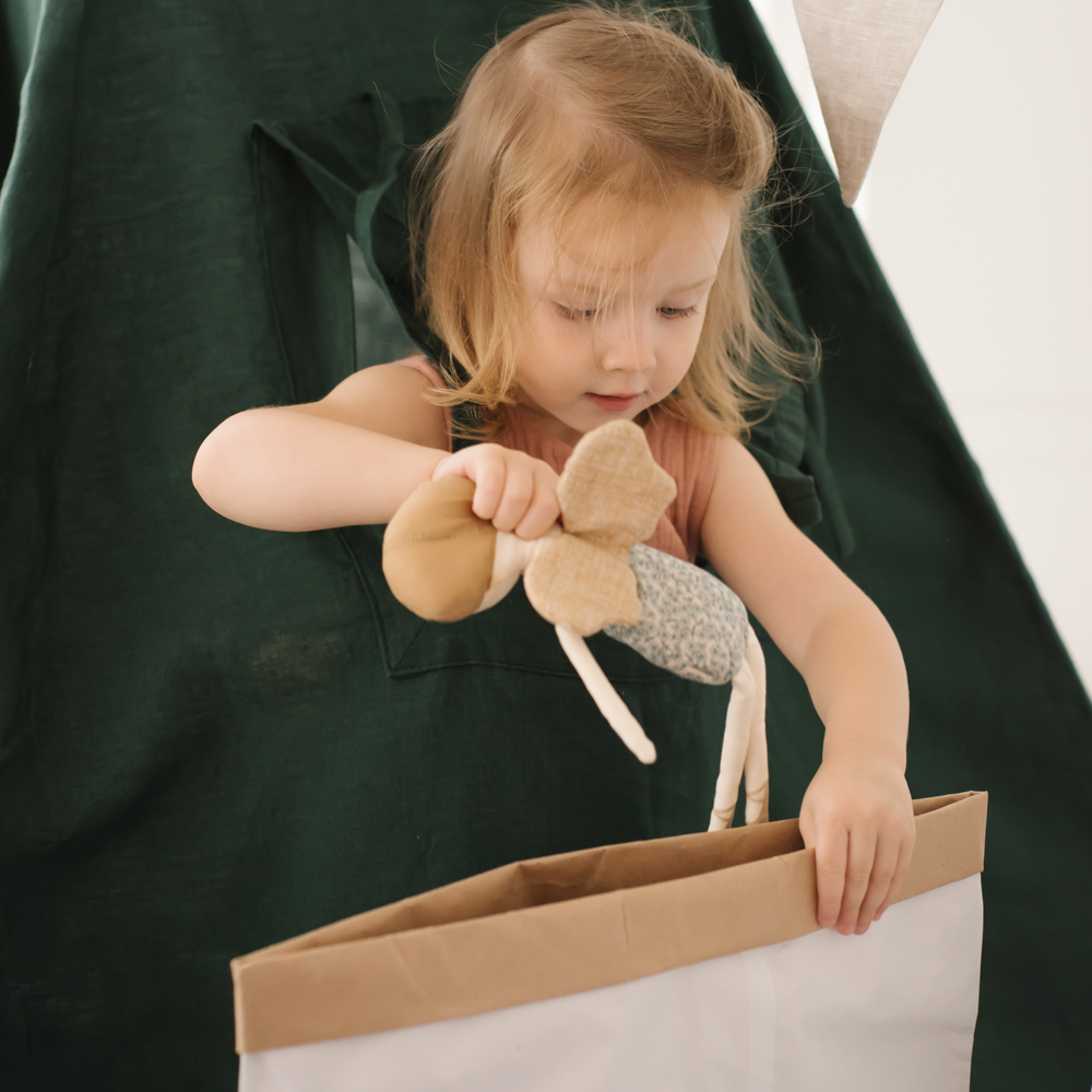 - Эко-мешок для хранения игрушек из крафт бумаги. Можно подобрать подходящую к вашему вигваму расцветку или заказать мешок с индивидуальным дизайном.
