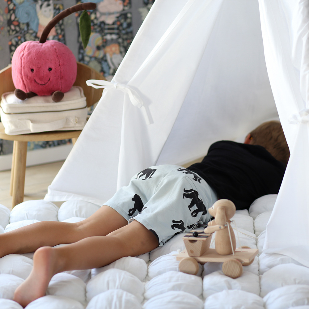 • Игровой коврик Бомбон. Ткань 100 % хлопок. Наполнение - синтешар. Толщина коврика 10 см, размер 105 х 105 см для стандартного вигвама и 125 х 125 для большого, квадрат под размер основания вигвама. Можно заказать коврик из той же ткани, что и вигвам (можно выбрать это в опциях в верхней части этой страницы) или из любой другой ткани.