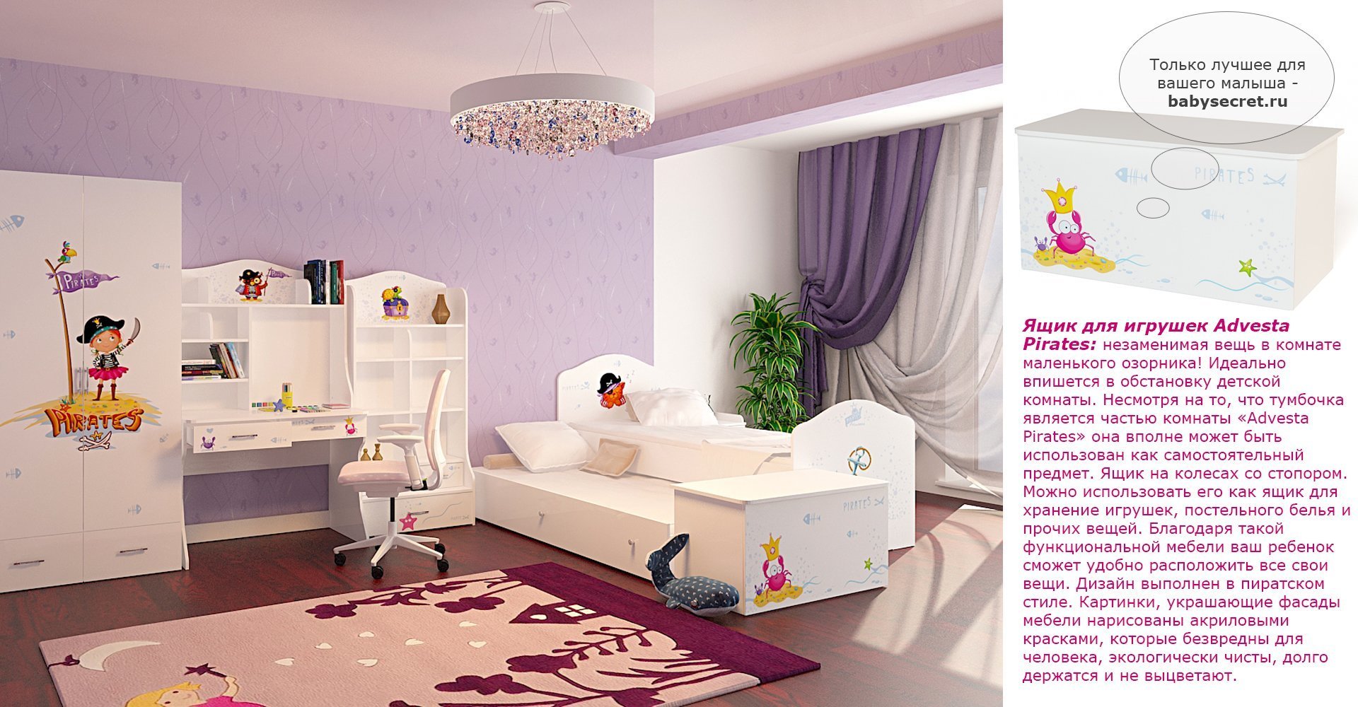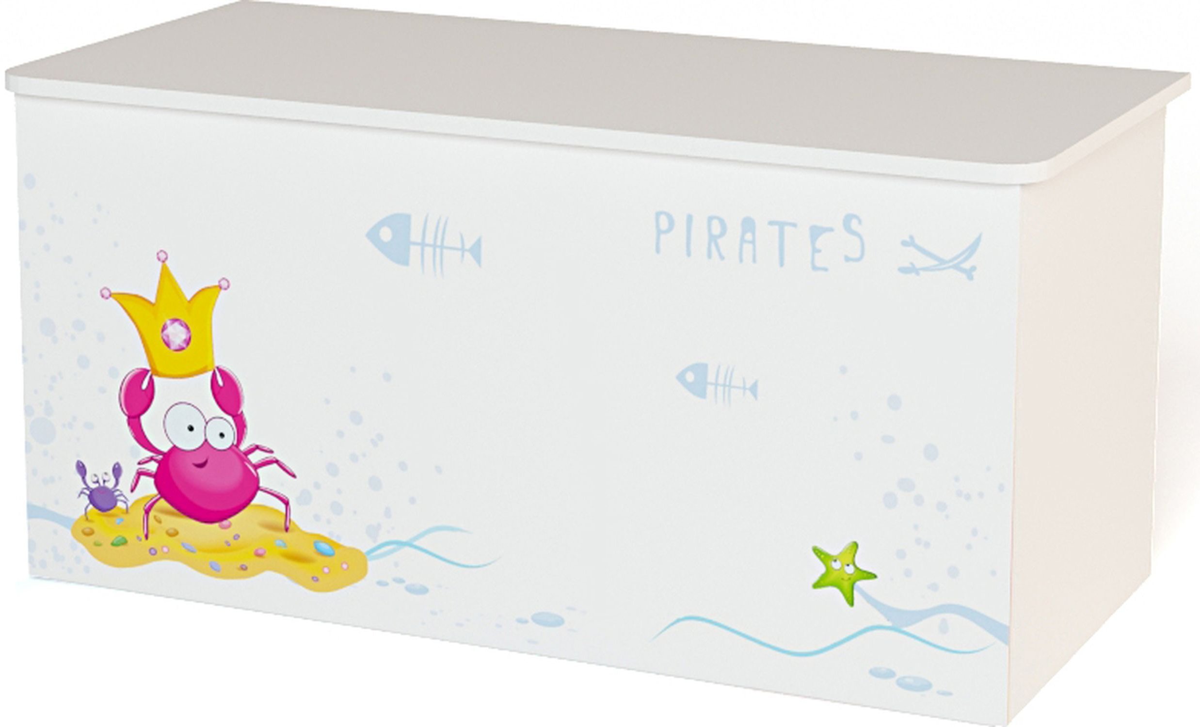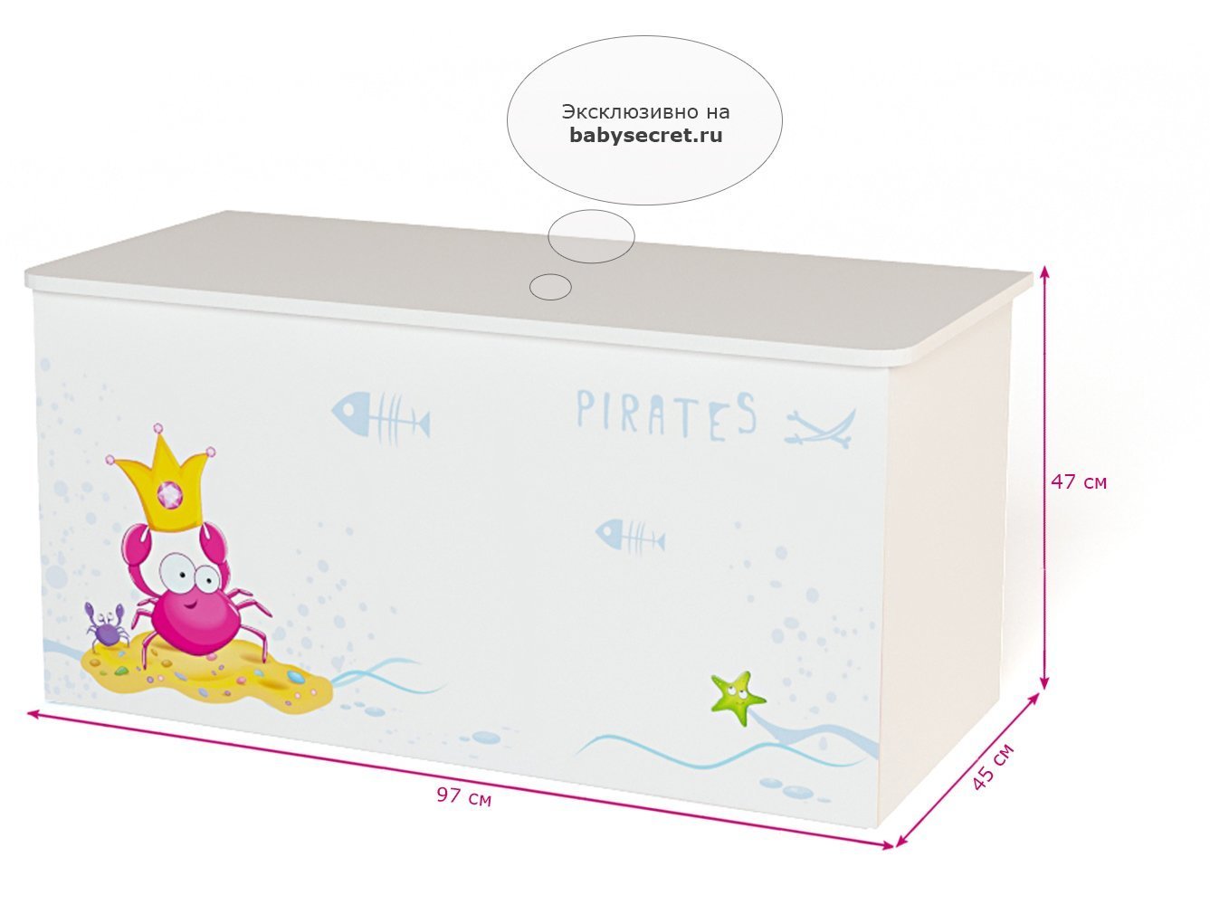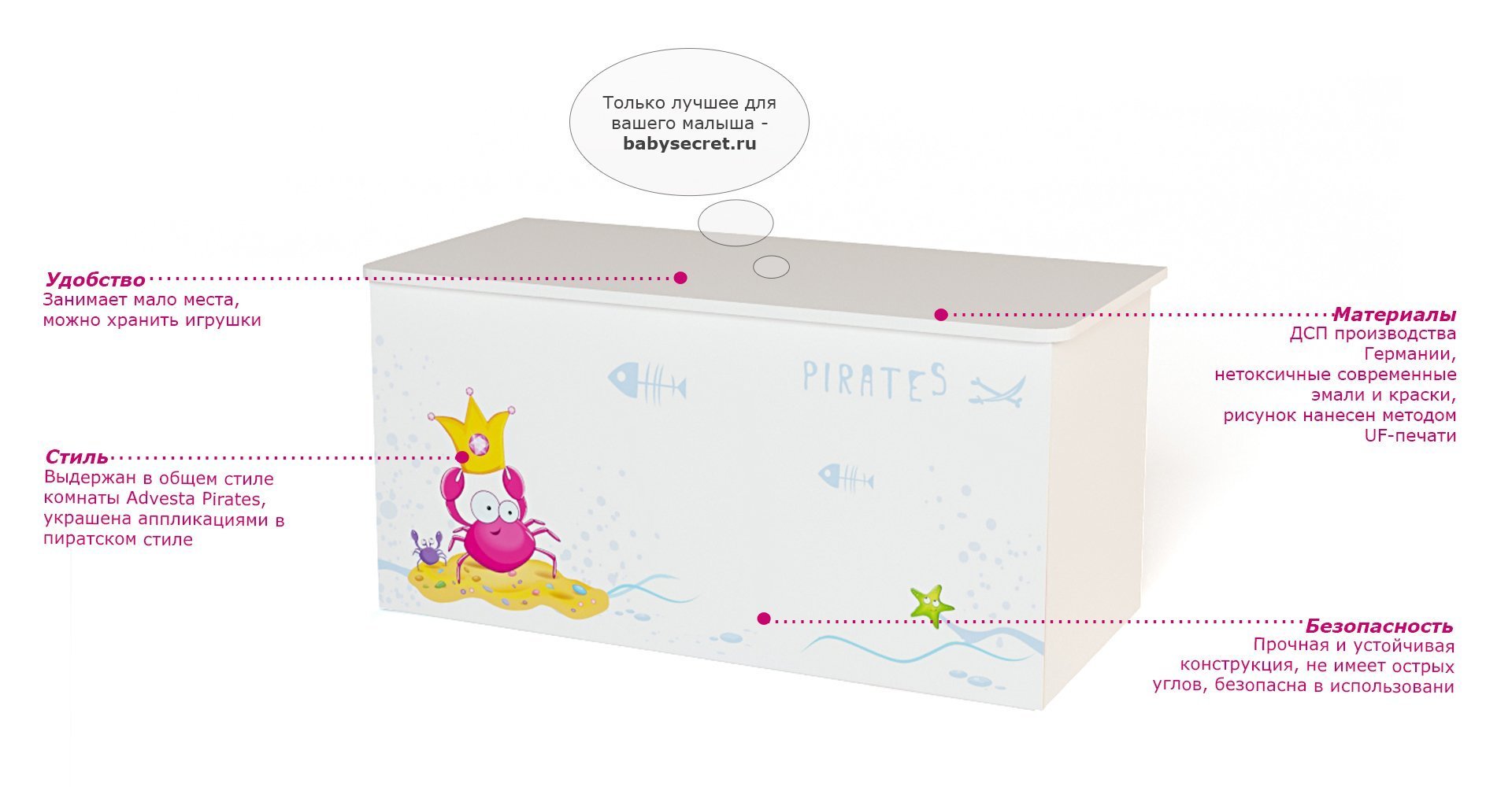 Приятные особенности ящика для игрушек Pirates:незаменимая вещь в комнате маленького озорника! Идеально впишется в обстановку детской комнаты. Несмотря на то, что тумбочка является частью комнаты «Pirates» она вполне может быть использован как самостоятельный предмет. Ящик на колесах со стопором. Можно использовать его как ящик для хранение игрушек, постельного белья и прочих вещей. Благодаря такой функциональной мебели ваш ребенок сможет удобно расположить все свои вещи. Дизайн выполнен в пиратском стиле. Картинки, украшающие фасады мебели нарисованы акриловыми красками, которые безвредны для человека, экологически чисты, долго держатся и не выцветают.