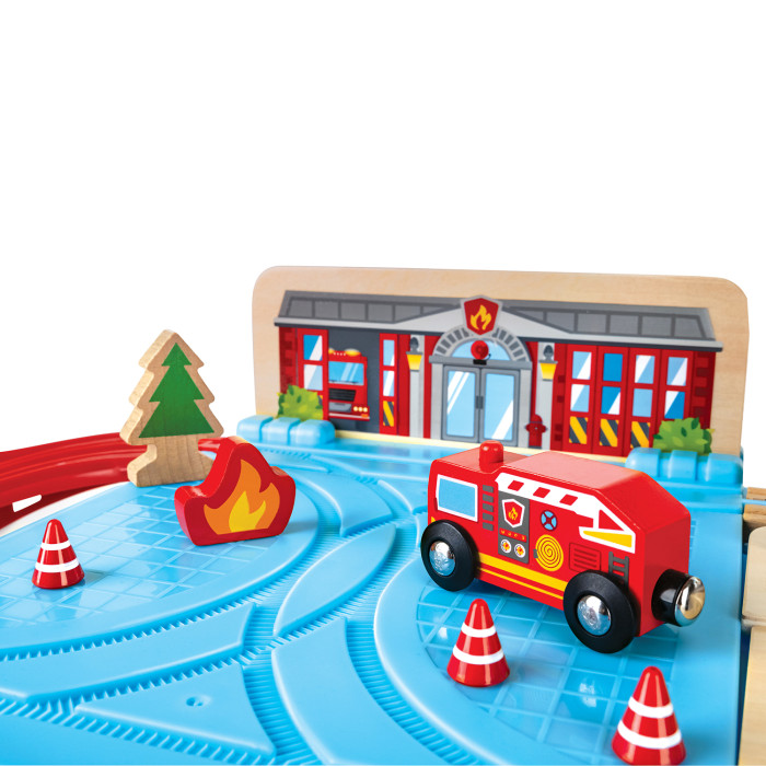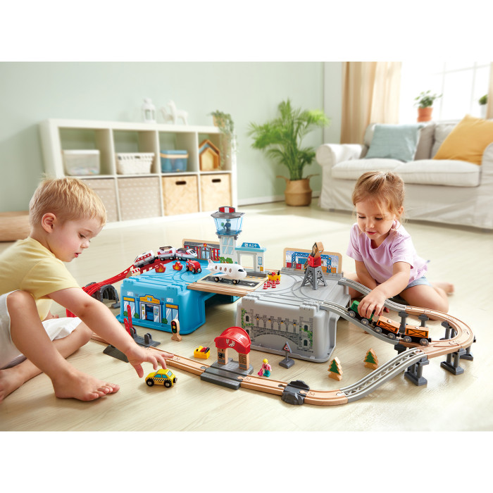 В комплекте:3 пластиковых S-образных пути, 1 Y-образный путь, 4 изогнутых пути, 8 прямых путей, 2 восходящих пути, 4 деревянных украшения, 1 грузовой поезд с 2 вагонами, 1 платформу, 1 сторожевую башню, 1 самолет, 1 светофор, 1 пожарная машина, 2 пожарных блока, 1 грузовик, 2 грузовых блока, 1 самолет, 1 конец гусеницы, 1 такси, 1 кран, 4 блока деревьев, 1 железнодорожный переезд, 1 каменистая трасса, 1 пластиковая гора, 8 пирсов, 1 высокоскоростной паровоз с 2 легковыми автомобилями, 2 треугольных дорожных знака, 2 статуэтки, 6 конусных блоков и 2 стойки для инструментов с 10 инструментами.